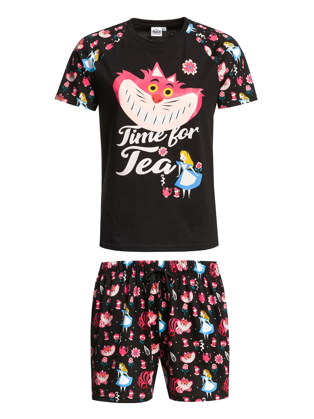 Dieser herzerwärmende schwarze Alice im Wunderland Pyjama besteht aus einem angenehmen Baumwollmaterial. Das Oberteil ist figurbetont geschnitten und hat kurze Arme. Als Frontprint findet sich das Gesicht des Grinsekatze in pink wieder. Darunter der Schriftzug ‚Time for Tea‘ was soviel bedeutet wie ‚Zeit fĂĽr Tee‘. Darunter befindet sich die hĂĽbsche Alice im blauen Kleid, welche an einer Kanne warmen Tee schnuppert. Die kurzen Ă„rmel mit niedlichen Elementen, wie zB. Teetassen, Federn, BlĂĽten und kleinen Grinsekatzen aus dem Film versehen. Derselbe Druck zeigt sich auch auf der kurzen Pyjamahose. Sie hat einen breiten Gummibund mit SchnĂĽrung und sorgt daher fĂĽr einen bequemen Sitz. Hol dir den passenden ‚Alice in Wonderland Tea Pyjama‘ fĂĽr den nächsten Sofa Disney Abend!