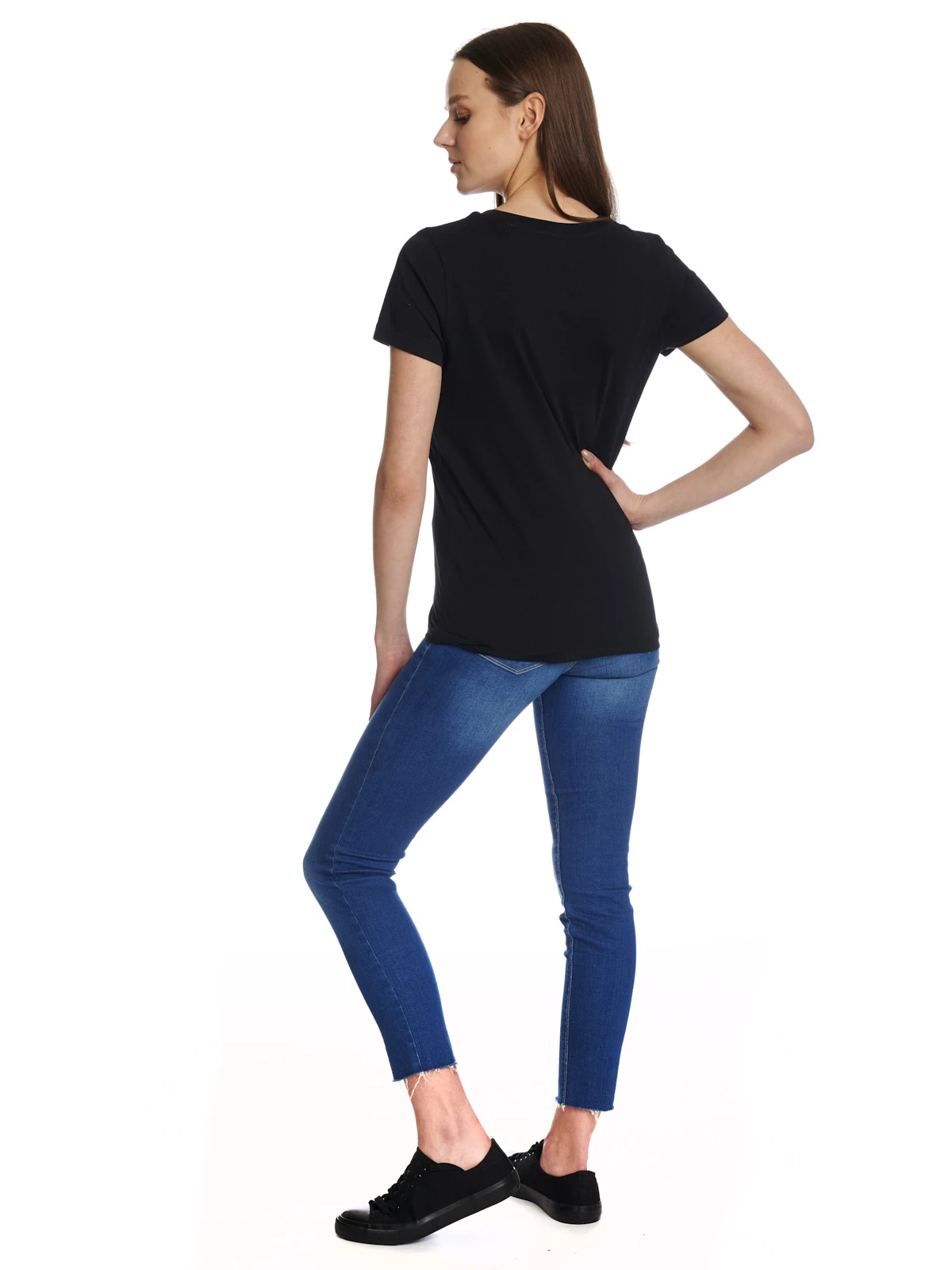 Dieses schwarze Damen T-Shirt besteht aus einem angenehmen, hochwertigen Bio-Baumwollmaterial. Es hat einen runden Halsausschnitt, kurze Ärmel und ist figurbetont geschnitten.