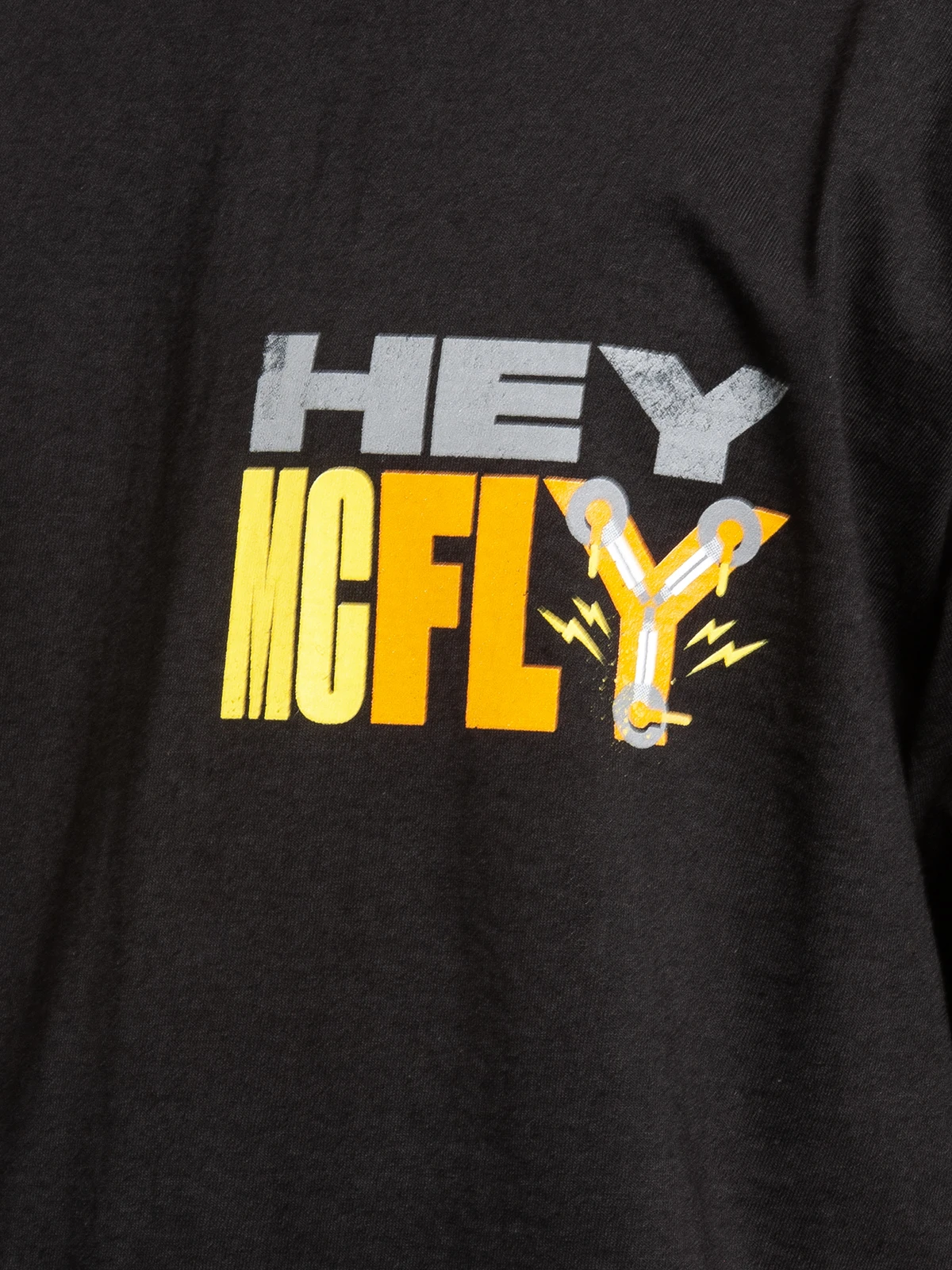 Der im vorderen linken Brustbereich platzierte Aufdruck zeigt den bunten Schriftzug ‚HEY MCFLY‘ was soviel bedeutet wie ‚Hallo McFly‘ Das Y symbolisiert auf diesem Shirt viel Elektrizität. Wenn du die richtige Spannung hast dann ist dies genau das richtige Shirt für dich.