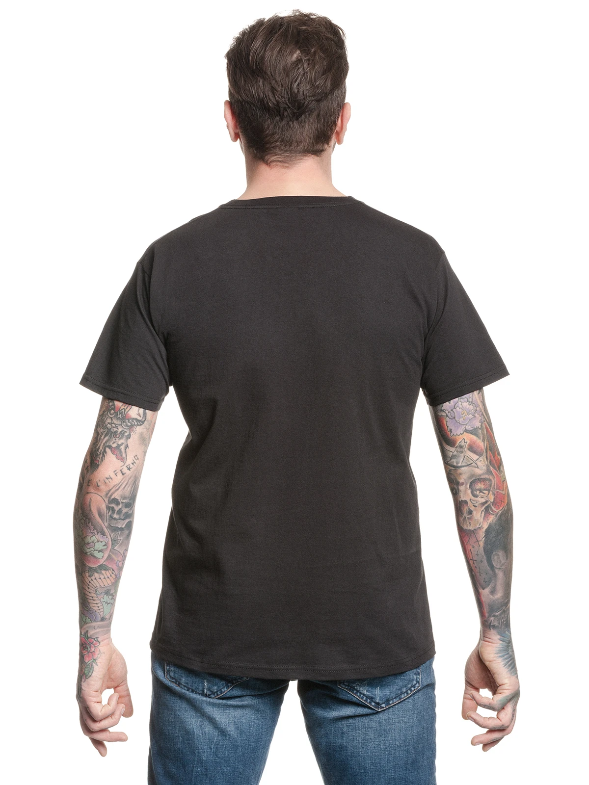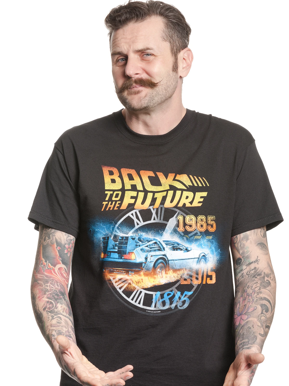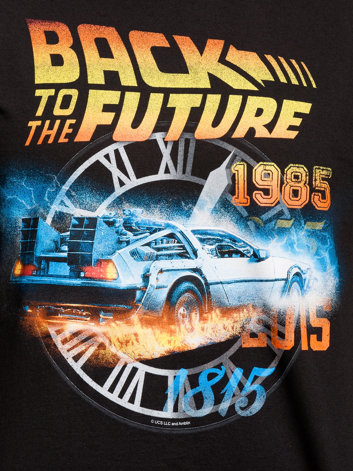 Der Aufdruck zeigt das Auto DeLorean – die Zeitmaschine von Zurück in die Zukunft. Im Hintergrund eine Uhr und zum anderen die Schriftzüge ‚BACK TO THE FUTURE – 1985 – 2015 – 1815‘. Der Druck wirkt durch die Feuer und Blitzeffekte sehr lebendig. Wenn du die richtige Einstellung hast dann ist dies genau das richtige Outfit für dich. In der Filmtrilogie, die 1985 begann, geht es um den Jugendlichen Marty McFly, der durch eine Zeitmaschine in das Jahr 1955 reist und später auch in die Zukunft. Natürlich verursacht er mit seinem plötzlichen Auftauchen jede menge Chaos, denn alle seine Handlungen haben Auswirkungen auf die Zeitlinie und er braucht mehr als einmal die Hilfe seines Freundes Doc Brown um den Schlamassel, den er angerichtet hat wieder gerade zu biegen.