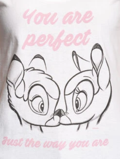 Der Frontprint zeigt eine Skizzierung des hübschen Gesichts von Bambi und seiner Freundin. Der Schriftzug ‚You are perfect just the way your are‘ was bedeutet ‚du bist perfekt genauso wie du bist‘ komplettieren das Design. Ein wirklich total süßes Shirt, in das wir uns sofort verliebt haben. Ein Herzchen für Bambi und ein Herzchen für Dich!