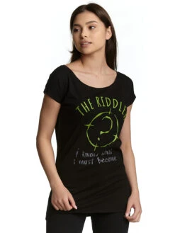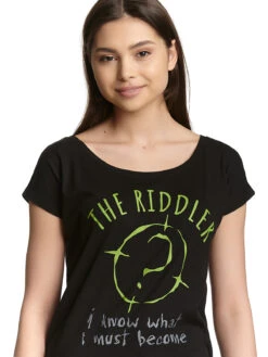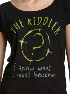 Rätselfreunde aufgepasst! Der coole Druck zeigt das Symbol des Riddler, das grĂĽnlich gelbe Fragezeigen in einem Kreis. DarĂĽber der Schriftzug ‚The Riddler‘. Unter dem Fragezeigen steht ‚I know what I must become‘ was ĂĽbersetzt so viel wie ‚Ich weiĂź was ich werden muss‘ bedeutet und sich auf eine Aussage vom Riddler bezieht. Ein richtig tolles Shirt fĂĽr alle Rätselfreunde und diejenigen, die gerne auf Schatzsuche gehen.