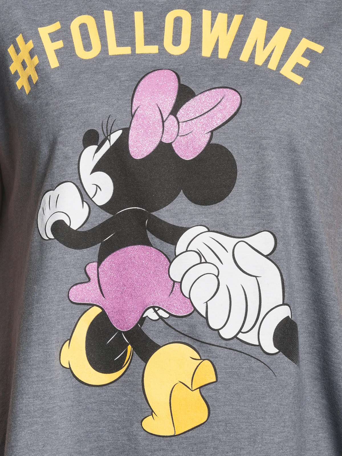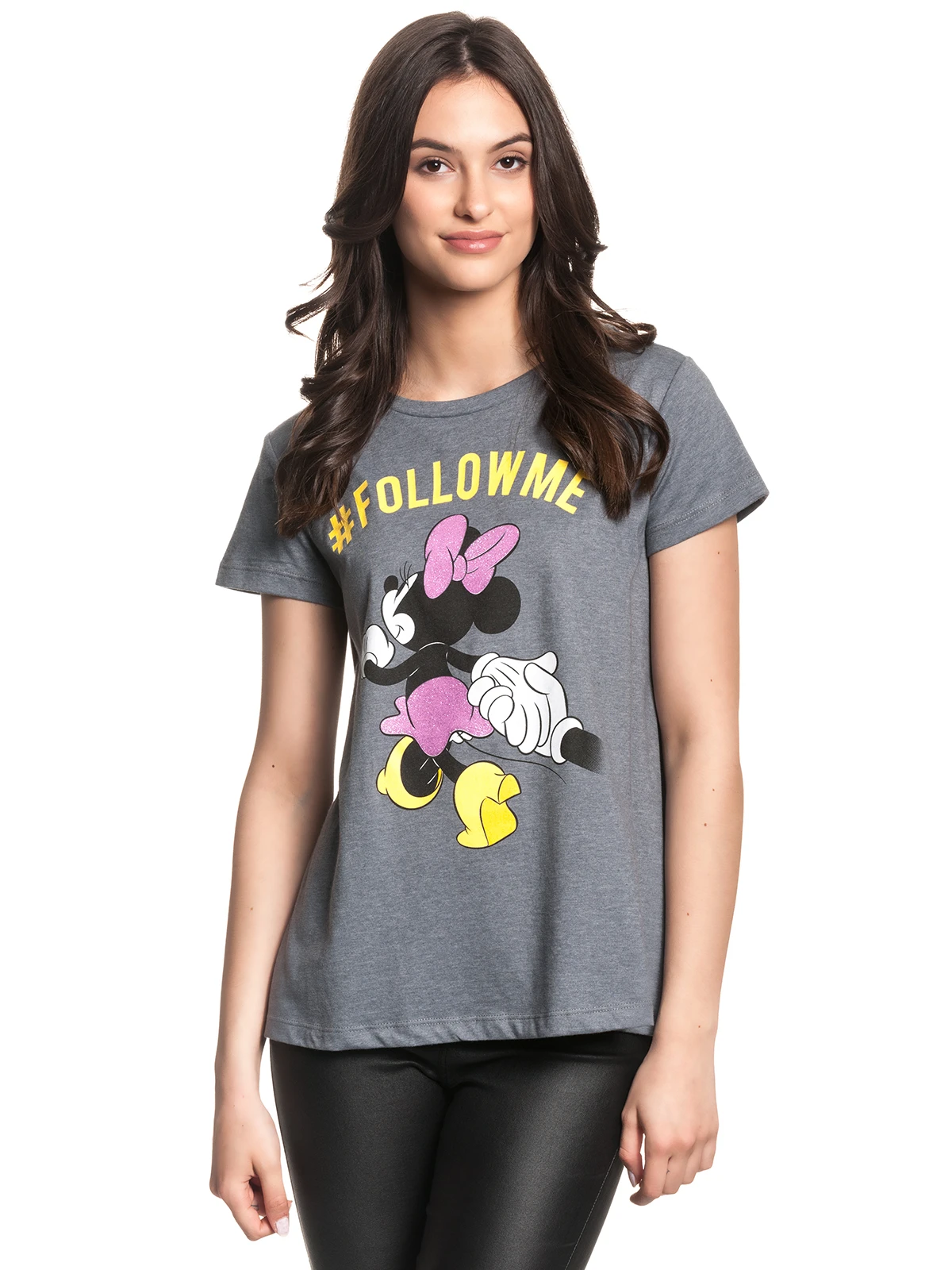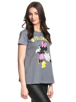 Dieses bezaubernde Mickey Mouse Damen T-Shirt besteht aus einem angenehmen Baumwoll-Mix. Es ist leger geschnitten, hat einen runden Halsausschnitt und kurze Ärmel. Der Frontdruck zeigt die herzallerliebste Minnie Mouse mit gelben Schuhen, rosa Röckchen und Schleife, Hand in Hand mit wem? Natürlich mit ihrem Freund Mickey Mouse! Der Schriftzug in gelb ‚#FOLLOW ME‘ komplettiert das Design. Rosa Rock und Schleife sind durch den rosa Glitzerdruck ein toller Eyecatcher! Wer möchte denn nicht der Aufforderung nachgehen dieser süßen Maus zu folgen? Für Disney Fans ist dieses Shirt ein perfektes Basic-Teil.