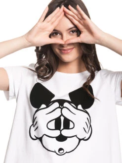 Der Frontdruck zeigt das Gesicht von Mickey Mouse, welches mutig zwischen seinen Fingern hervorlugt. Mickeys Ohren laden zum streicheln ein, denn sie sind mit einem samtweichen schwarzen Flockdruck versehen. Für Disney Fans ist dieses Shirt ein perfektes Basic-Teil.