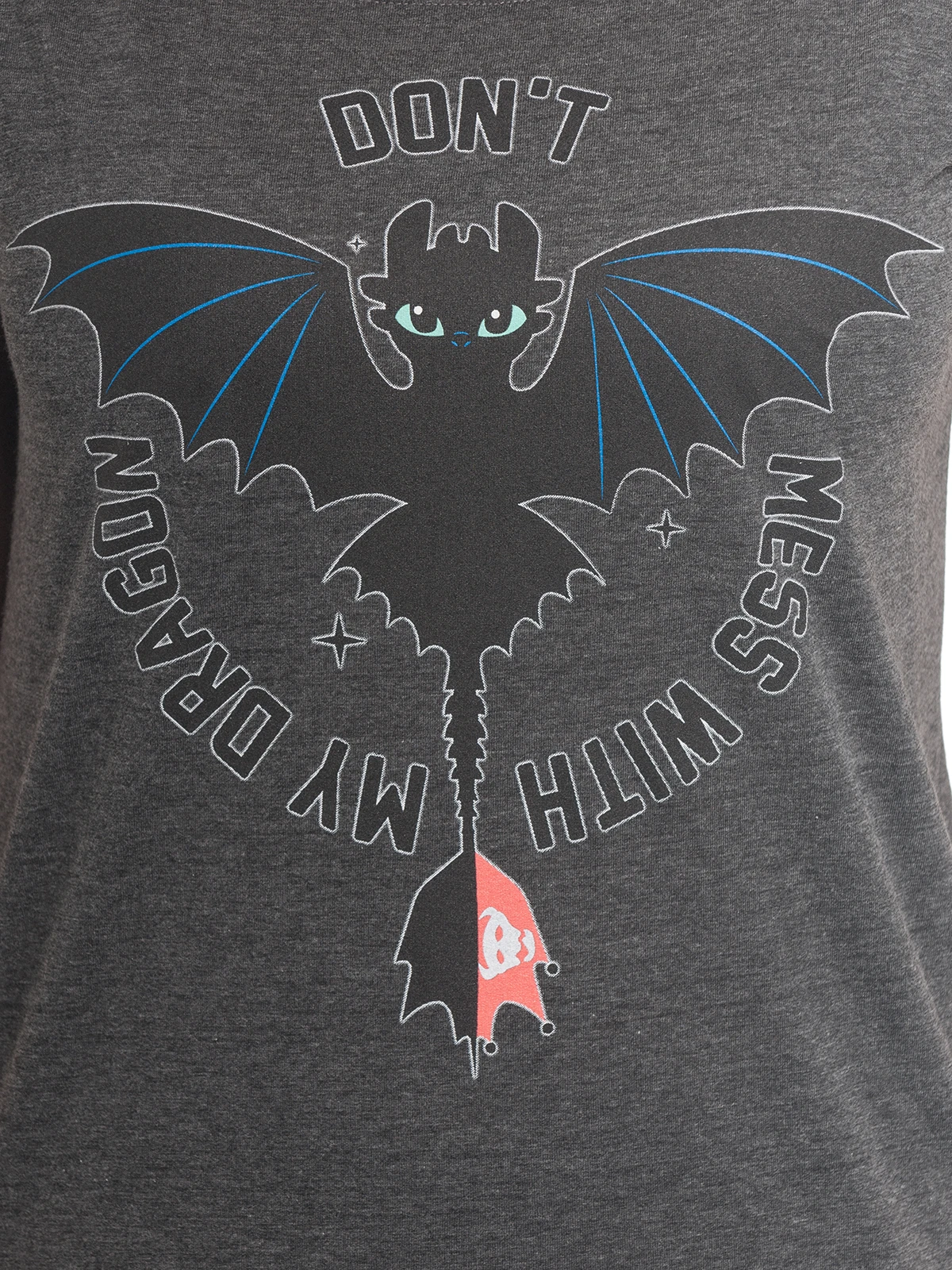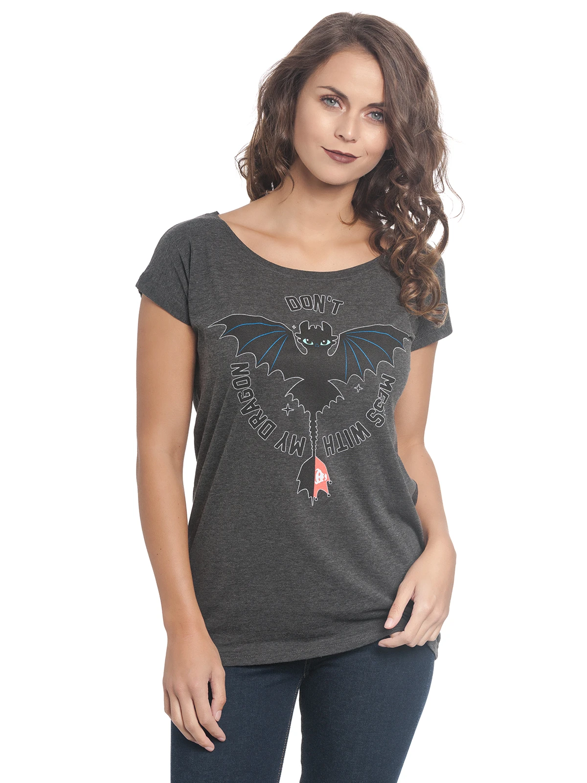 Der Frontprint zeigt den Schriftzug ‚Don’t mess with my dragon‘ – ‚Leg dich nicht mit meinem Drachen an‘. Das Design wird durch eine Abbildung des Nachtschatten Drachens Ohnezahn komplettiert.