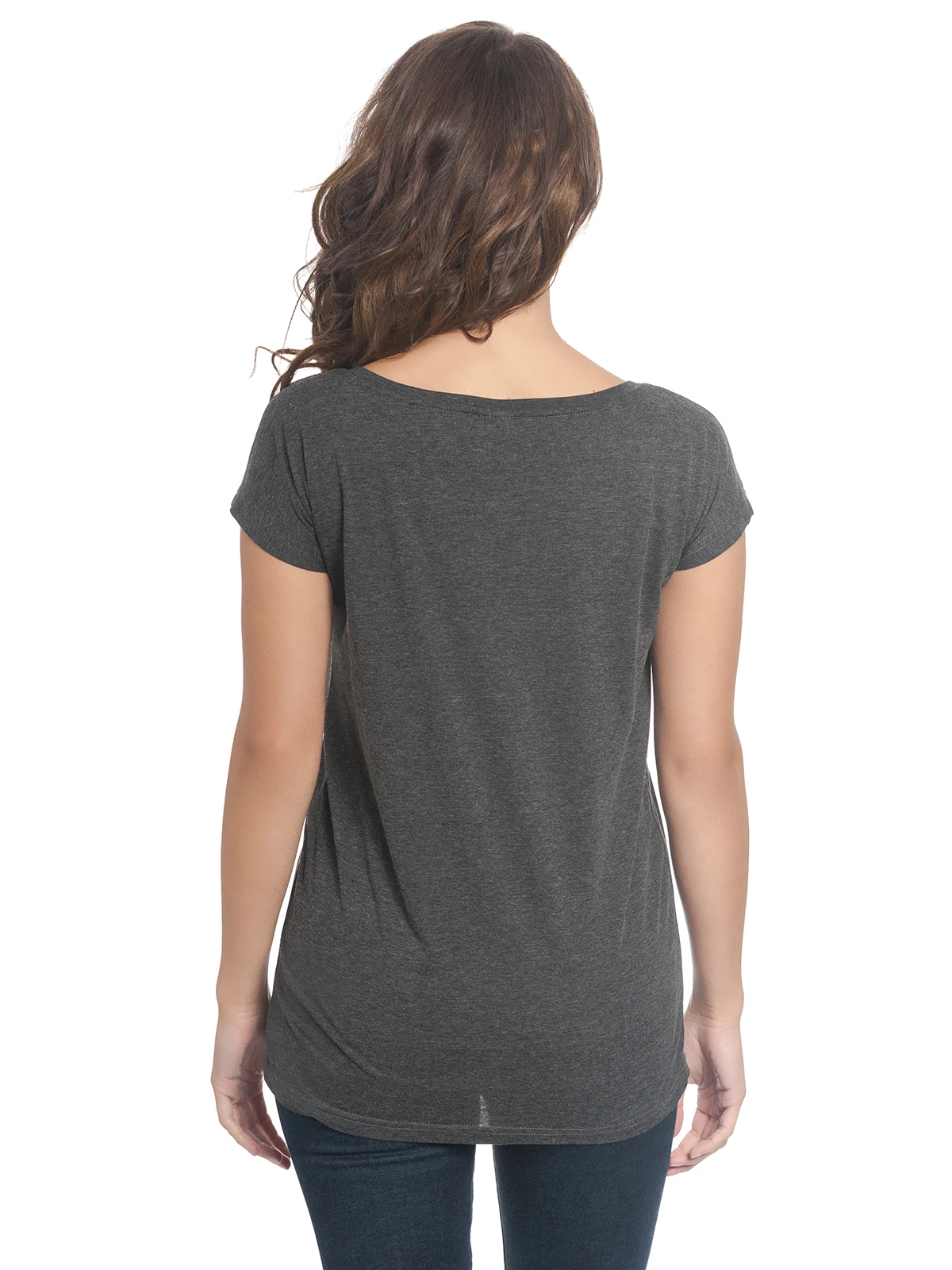 Dieses Damen T-Shirt besteht aus einem angenehmen Baumwollmaterial. Es ist locker geschnitten, hat einen weiten runden Halsausschnitt und kurze Ärmel.