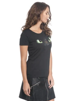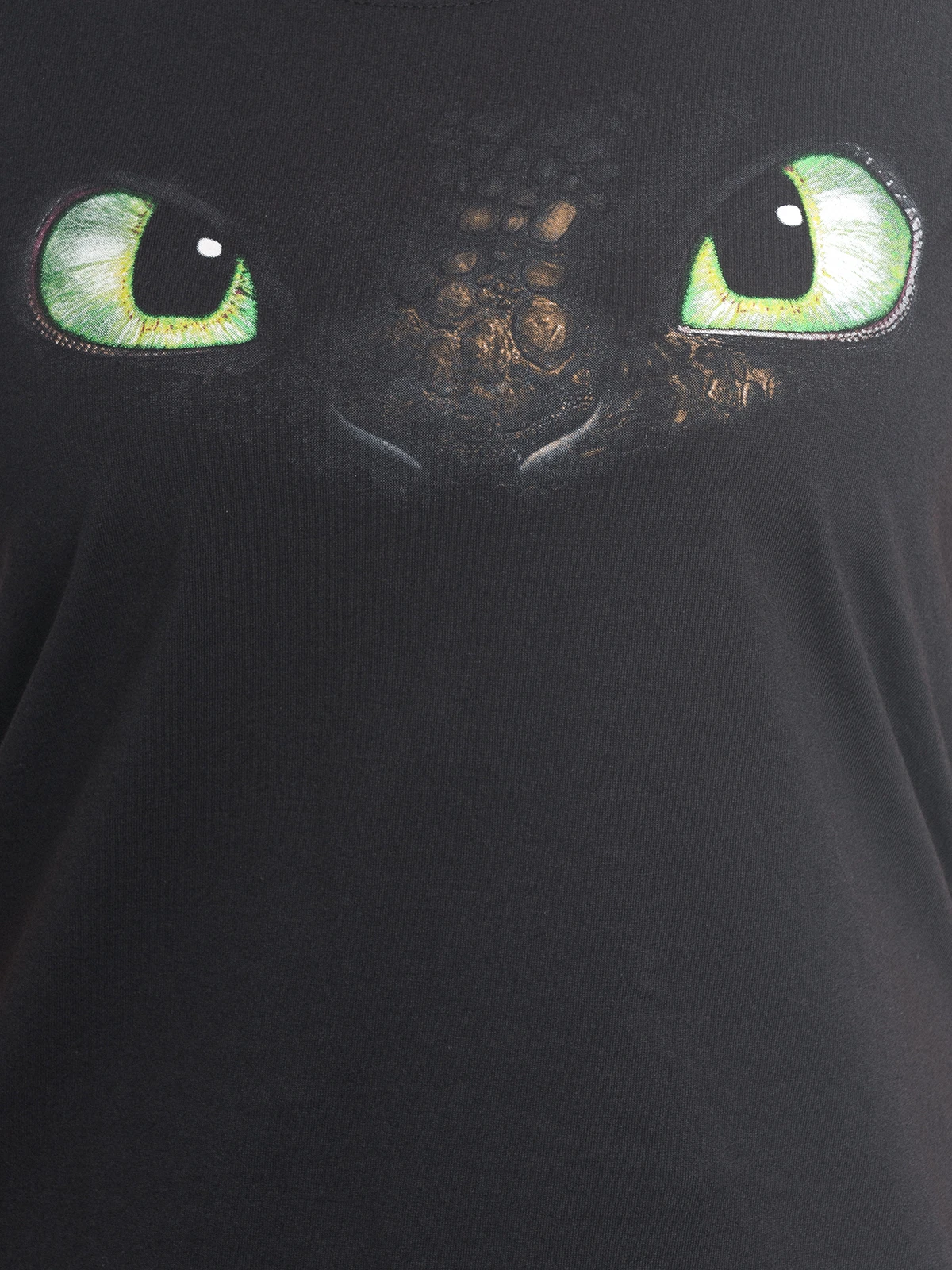 Der Frontprint zeigt das Gesicht des Drachen Ohnezahns mit groĂźen grĂĽnen Augen.