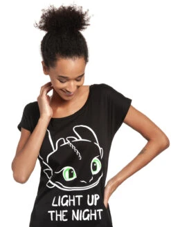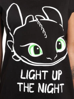 Der megacoole Druck zeigt die Zeichnung von Ohnezahn’s Kopf mit grünen Augen. Darunter der Schriftzug ‚Light up the Night‘ also ‚erhelle die Nacht‘, was in diesem Fall auch wörtlich zu nehmen ist, denn der Print hat den Effekt im dunkeln zu leuchten. Ein tolles Shirt für alle Freunde des Nachtschatten.