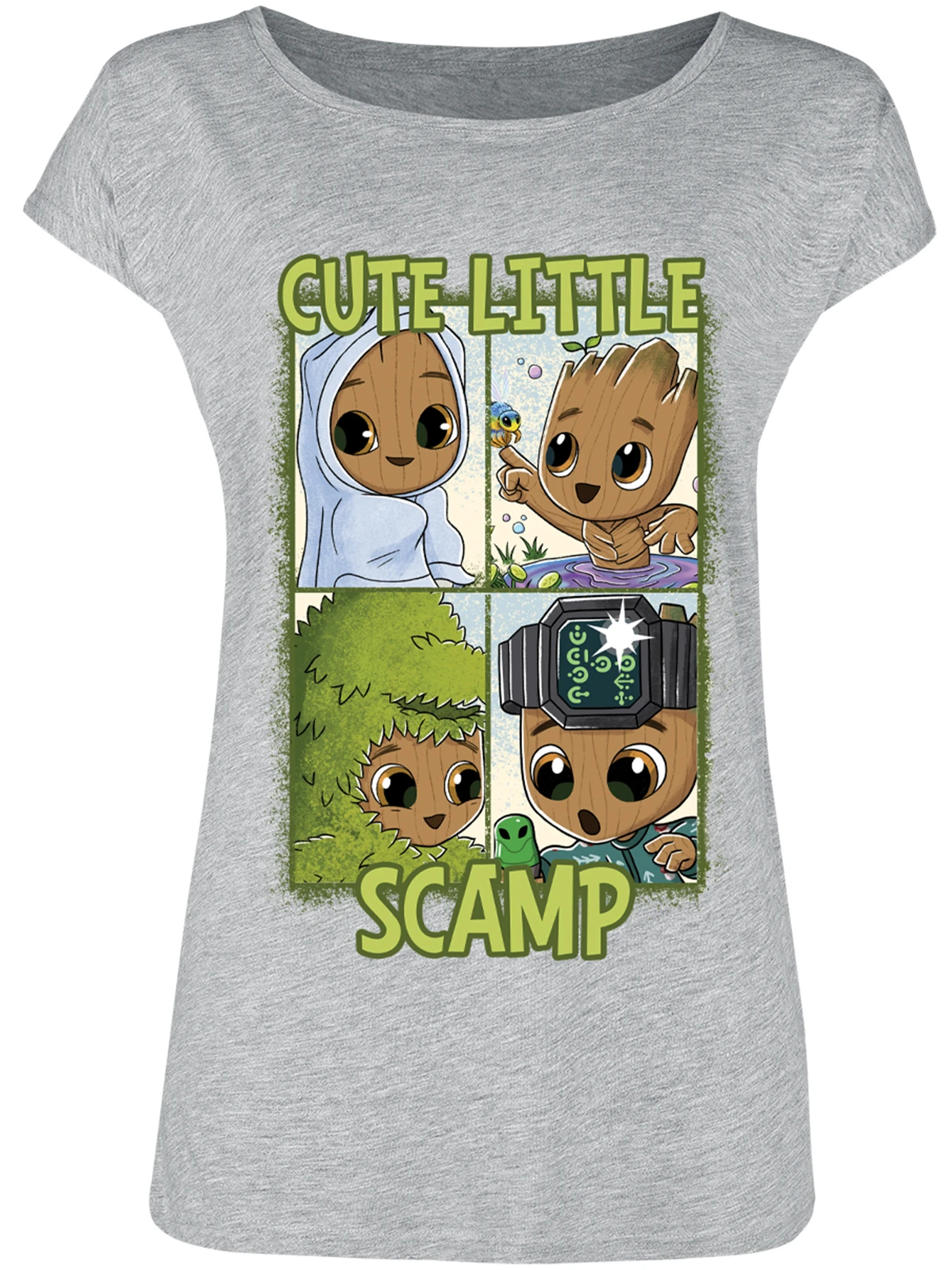 Der plakative Aufdruck zeigt vier Bilder von Baby-Groot in Comic Form. Dazu der Schriftzug: ‚Cute little Scamp‘ was übersetzt so viel bedeutet wie ’süßer kleiner Schlingel‘. Ein süßer Druck für alle Fans des kleinen baumähnlichen Wesens.
