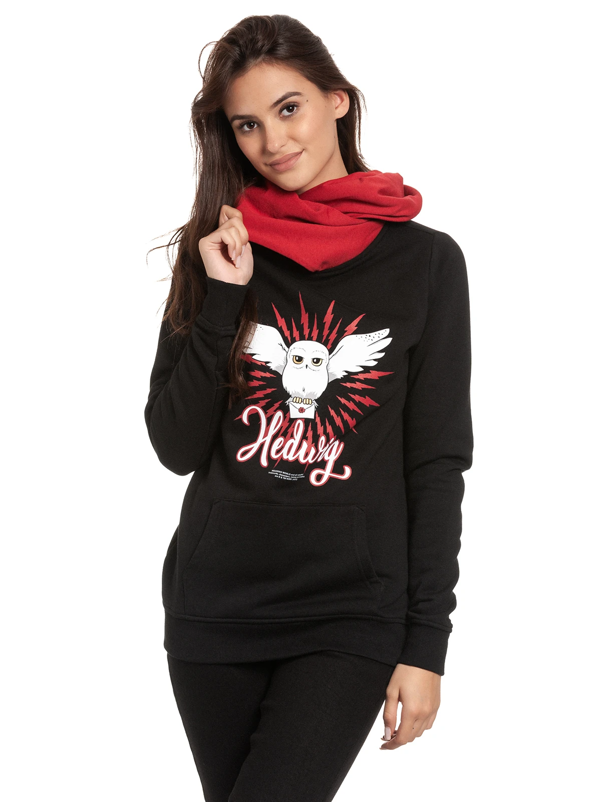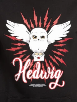 Der süße Druck zeigt Harry Potters Eule Hedwig, die einen Brief von Hogwarts in ihren Krallen hält. Darunter ist der weiße Schriftzug mit roter Outline ‚Hedwig‘. Der Druck ist in den Farben weiß und rot gehalten, was sehr gut zum ansonsten schwarzen Hoodie passt. Rote Blitze komplettieren das Design.