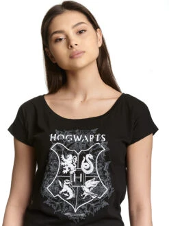 Der tolle Druck zeigt das Wappen von Hogwarts, der Schule für Hexerei und Zauberei, sowie den Schriftzug. Im Hintergund sind in grau Blumen und Blätterranken zu sehen, die sich teilweise durch das Wappen schlängeln. Ein richtig schickes Shirt für alle, die vom sprechenden Hut noch nicht für ein bestimmtes Haus zugeteilt wurden. Und das beste daran: Partnerlook ist kein Problem, denn das Shirt gibt es auch in der Männervariante.