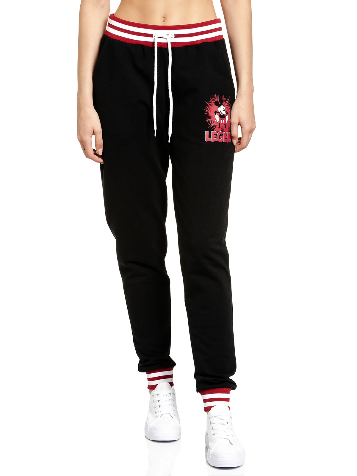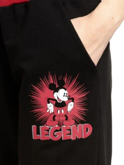 Die coole Jogpants ist aus einem angenehmen Baumwollmaterial mit Elasthananteil. Sie hat einen breiten Grummibund aus einem rot-weiß gestreiften Rippbündchen. Ein Tunnelzug mit eingearbeiteten Bindeband sorgt zur zusätzlichen Weitenregulierung. Seitliche Eingirfftaschen unterstreichen den bequemen Look. Die langen Hosenbeine enden ebenfalls in rot-weiß gestreiften Rippbündchen. Der Aufdruck auf dem linken Bein zeigt Mickey Mouse, der die Hände in die Hüften stemmt. Der Hintergrund der Figur ist ebenfalls rot, so dass sie sich gut von der schwarzen Pants abhebt. Zusätzlich ist der Schriftzug ‚Legend‘ zu sehen. Eine tolle Hose, die dir definitiv den nächsten Disney Abend versüßt.