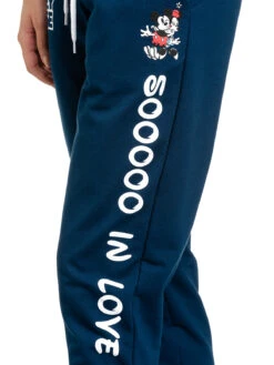 Die sĂĽĂźe Disney Jogpants ist aus einem leichten Baumwollmaterial mit Elasthananteil. der obere Bund ist aus einem breiten gestreiften BĂĽndchen, ein Tunnelzug und ein Bindeband dienen der zusätzlichen Weitenregulierung. Seitliche Eingrifftaschen machen die Hose besonders bequem. Der Druck auf der rechten Seite zeigt den Schriftzug ‚Disneys Mickey Mouse‘, ĂĽber das linke Bein verteilt sich der Druck von Mickey Mouse, der stĂĽrmisch von Mickey Mouse umarmt und gekĂĽsst wird. Darunter verläuft auf dem Oberschenkel der Schriftzug ‚Sooooo in Love‘ was so viel wie ’sooooo verliebt‘ bedeutet. Die langen Hosenbeine werden ebenfalls mit einem gestreiften BĂĽndchen abgeschlossen. Der Schnitt der Hose ist gerade und wird unten engen. Mickey und Minnie Mouse sind eine der bekanntesten Liebespaare und so ziemlich jeder kennt sie. Was gibt es also schöneres, als sie auf einer Jogginghose spazieren zu tragen? Nichts, genau und deswegen darf die Pants auch in keinem Kleiderschrank fehlen.