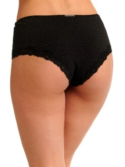 black is beautiful Das dreier Set Hipster Pants besteht aus drei gleichen Höschen, die aus einem angenehmen Baumwollmaterial mit Elasthananteil sind. Die Höschen haben einen bequemen Gummibund, der mit einer schwarzen Spitzenlitze, sowie einer schwarzen Satinshleife und einem Metallanhänger in Katzenform verziert ist. Die Beinausschnitte werden mit einer Bordüre aus schwarzer transparenter Spitze abgeschlossen. Die Höschen sitzen enganliegend und tragen nicht auf. Ein Hipster ist unifarben schwarz, ein Hipster ist schwarz-weiß gestreift und ein Hipster hat weiße kleine Punkte auf schwarzem Stoff. Ein cooler Basic-Pack, der ein bisschen Abwechslung in den Alltag bringt. Natürlich gibt es die Höschen auch als Pantie-Version. Die Hipster Pants fallen etwas größer aus und können eine Nummer kleiner gekauft werden