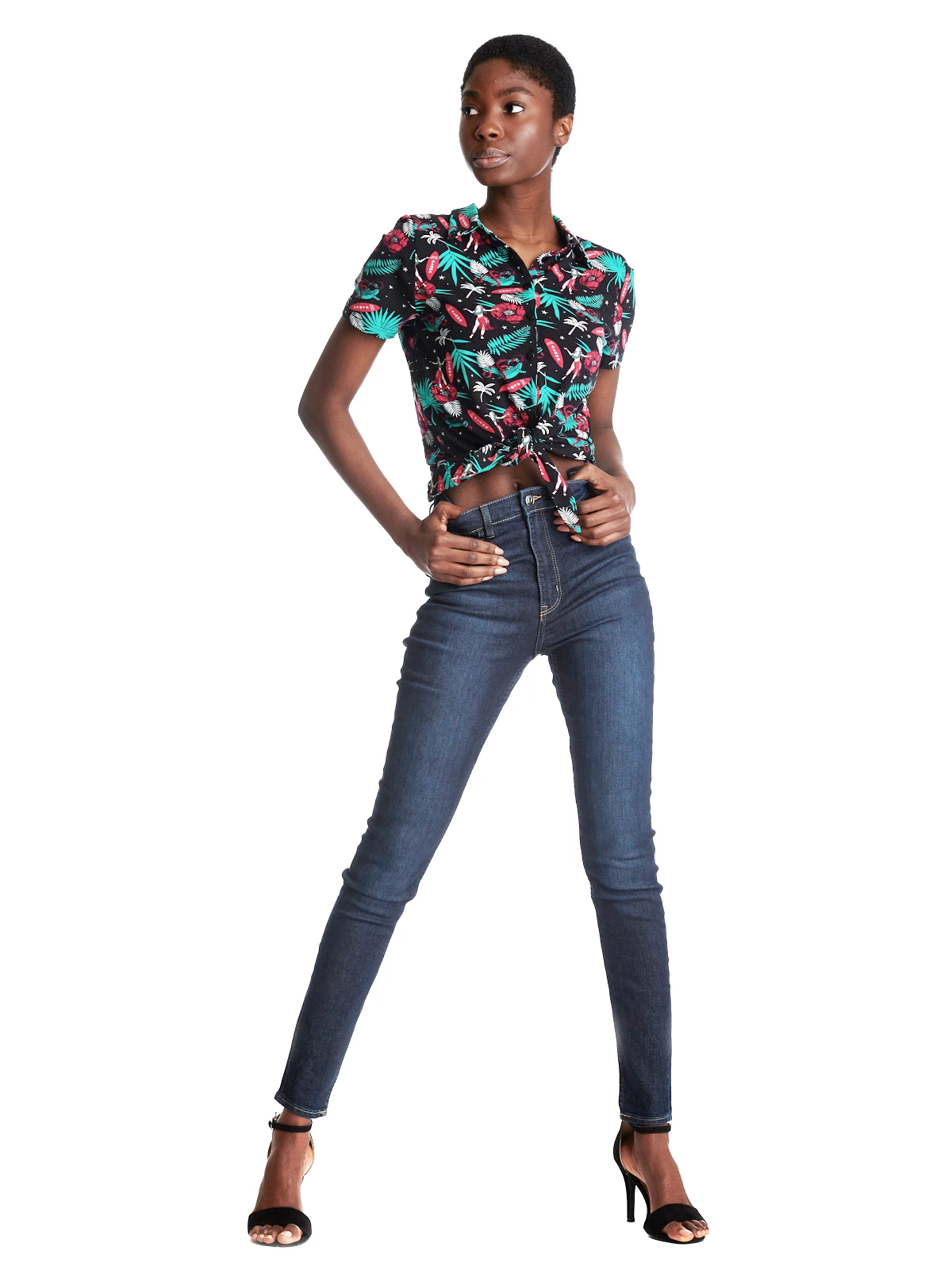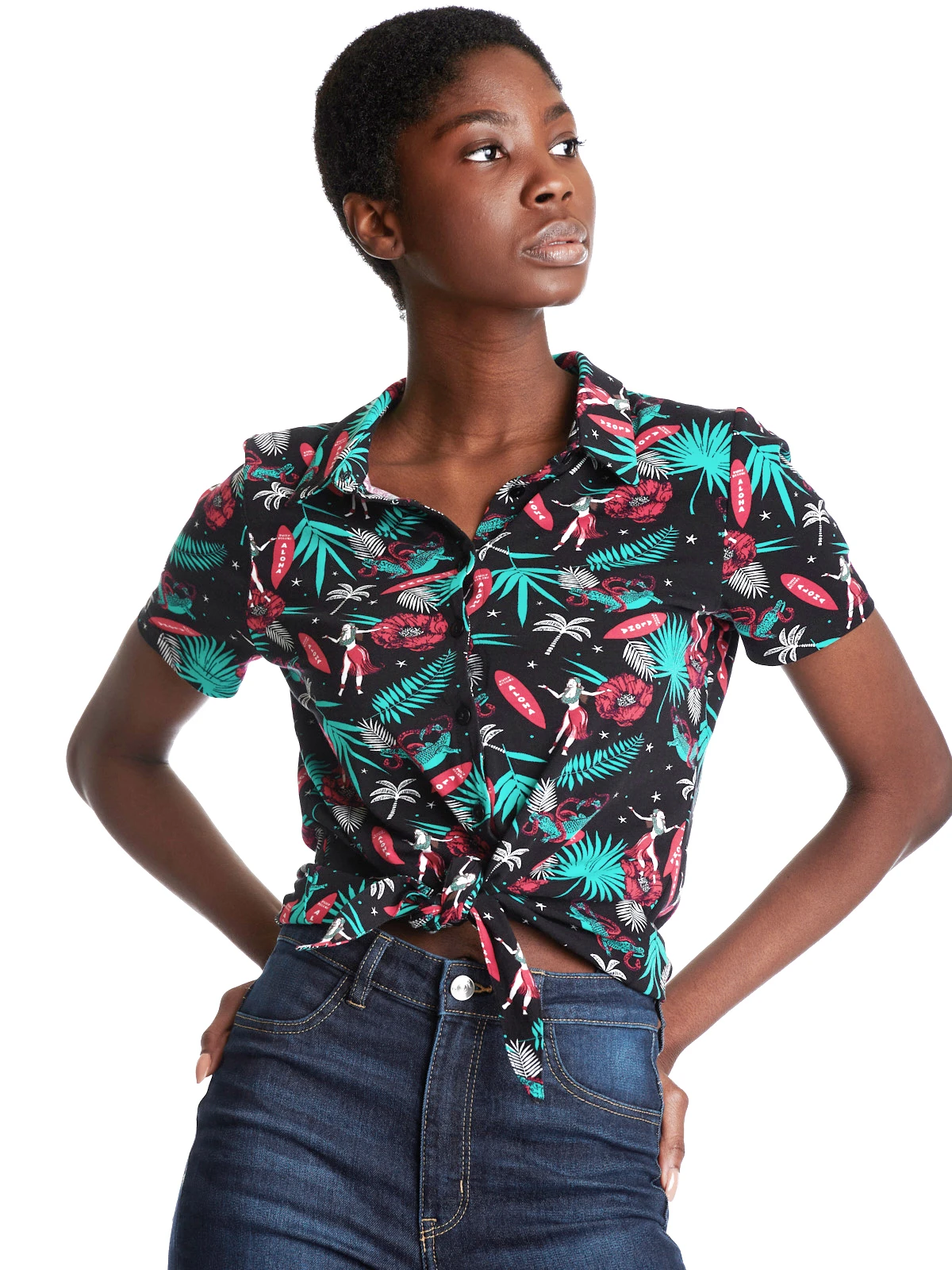 Surfer Fans aufgepasst – jetzt wird es sommerlich mit der neuen Pussy Deluxe Kollektion Die coole Shortbluse ist aus einem angenehmen Baumwollmaterial mit Elasthananteil. Sie ist figurbetont geschnitten und wird vorne zusammengeknotet, dass sie leicht Bauchfrei wird. Die Bluse hat kurze Arme, einen Hemdkragen und eine durchgängige Knopfleiste. Der Druck zeigt verschiedene pinke und türkisfarbene Motive wie eine Hula-Tänzerin, ein Surfbrett oder Palmenblätter auf schwarzem Stoff. Die Pussy Deluxe ‚Aloha-Reihe‘ ist absolut cool und stylisch zugleich. Durch den bunten Druck zaubert es frische in den Alltag und dir definitiv ein Lächeln ins Gesicht. Aloha – Pussy Deluxe.