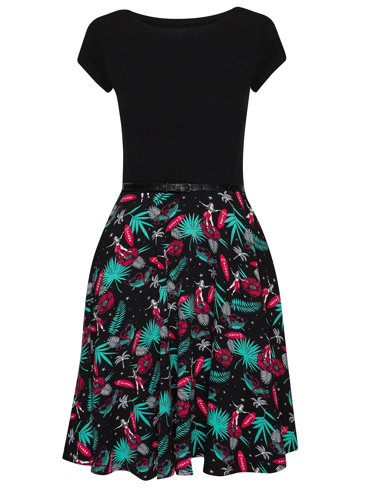 Aloha Pussy Deluxe Das süße Pussy Deluxe Kleid ist aus einem angenehmen Baumwollmaterial mix Elasthananteil. Es ist in A-Linie geschnitten und hat einen Pettycoat Rock, der mit einem Tüllstoff aus Polyester gefüttert ist. Das Kleid hat einen runden Halsausschnitt und kurze Arme. Das Obrteil ist figurbetont, enganliegend und unifarben schwarz. Der ausgestellte Rockteil ist mit verschiedenen Motiven wie einem Hulamädchen, einem Surfbrett oder Palmenblättern in den Farben pink und türkis bedruckt. Der eingenähte Tüll sorgt für einen guten Sitz und einen tollen Schwung. Ein Kunstledergürtelchen überdeckt die Teilungsnaht und bildet noch mal ein süßes Detail. Das ‚Aloha Dress‘ überzeugt mit tollen Farben und einem fantastischem Druck. Es passt hervorragend zu klassischen Pumps und einer kurzen Strickjacke.