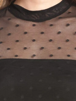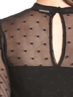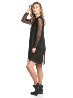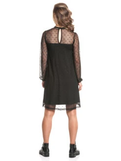 Dieses Kleid ist garantiert eine Punktlandung! Dieses coole Kleid besteht aus einem schwarzen, weichen Baumwollstoff und einem transparenten schwarzen Pünktchentüll. Es ist leicht ausgestellt und hat ein lockeren Schnitt. Der kleine Stehkragen inklusive des Schulterbereichs, sowie die langen Ärmel sind nicht mit dem schwarzen Baumwollstoff unterfüttert. Ein Gummibund unten an den Ärmeln sorgt für einen guten Sitz. Im Nacken wird der Stehkragen mit einem kleinen Knopf geschlossen. Dadurch entsteht ein neckisches Peephole im Rückenbereich. Das Rockteil umspielt locker die Beine und ist leicht ausgestellt. Dieses Kleid ist definitiv ein Hingucker! Kombiniert mit coolen Boots und einer Lederjacke tanzt du damit wild über das nächste Rockkonzert. Für etwas formellere Anlässe lässt sich dieses Schmuckstück aber auch ganz wunderbar mit schwarzen Peeptoes und einem Blazer stylen! Casual chic leicht gemacht!