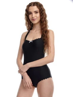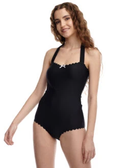 Ahoi ihr Badenixen und Meerjungfrauen. Der sĂĽĂźe Pussy Deluxe Badeanzug ist aus einem tollen Polyestermaterial mit Elasthananteil. Er ist figurbetont geschnitten, mit einem niedrigen Beinausschnitt. Die breiten Neckholderträger können im Nackenbereich gebunden werden. Der herzförmige Ausschnitt und die Beinausschnitte sind mit einer Bogenkante abgeschlossen. Eine kleine weiĂźe Satinschleife bilder einen sĂĽĂźen Hingucker am Dekolletee. Ein absolut zauberhafter Badeanzug, der sich nicht nur zum schwimmen, sondern auch hervorragend zum Sonnenbaden eignet. Er ist mit einem angenehmen Polyesterstoff unterfĂĽttert, so dass er blickdickt ist. Der ‚Black Lovers Swimsuit‘ ĂĽberzeugt mit schlichter eleganz und leichtigkeit und der Ausschnitt zaubert ein tolles Dekolletee.