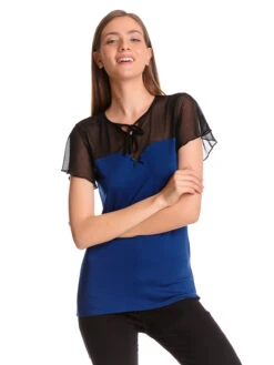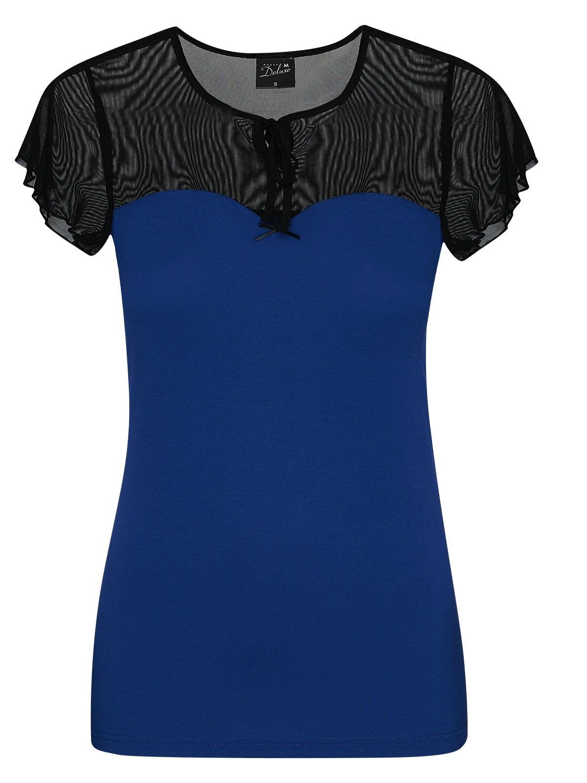 Lovely Chic mit Pussy Deluxe! Das sĂĽĂźe Pussy Deluxe Shirt ist aus einem angenehmen Viskosematerial mit Elasthananteil. Der TĂĽlleinsatz ist aus Polyamide. Das Shirt ist figurbetont geschnitten und hat kurze, weit geschnittene Arme. Der obere Teil des Shirts ist aus schwarzem transparentem TĂĽll. Der runde Halsausschnitt wird mit einem schwarzen Bindeband abgeschlossen, dass vorne zu einer Schleife gebunden wird. Somit entsteht ein kleines Guckloch. Der Dekolleteebereich wird mit einer kleinen schwarzen Satinschleife verziert. Das restliche Shirt ist königsblau und bildet eine tolle Farbkombination mit dem schwarzen TĂĽll. Das ‚Blue Lovely Chic Shirt‘ ist ein wundervoller Alltagsbegleiter und bringt dich mit dieser wundervollen Farbe zum strahlen. Der transparente TĂĽll macht es zudem neckisch und aufregend zugleich. Das Shirt passt hervorragend zum schwarzen Pencil Skirt oder auch zur schwarzen Jeans. Pumps oder Sneaker runden das Gesamtbild ab.