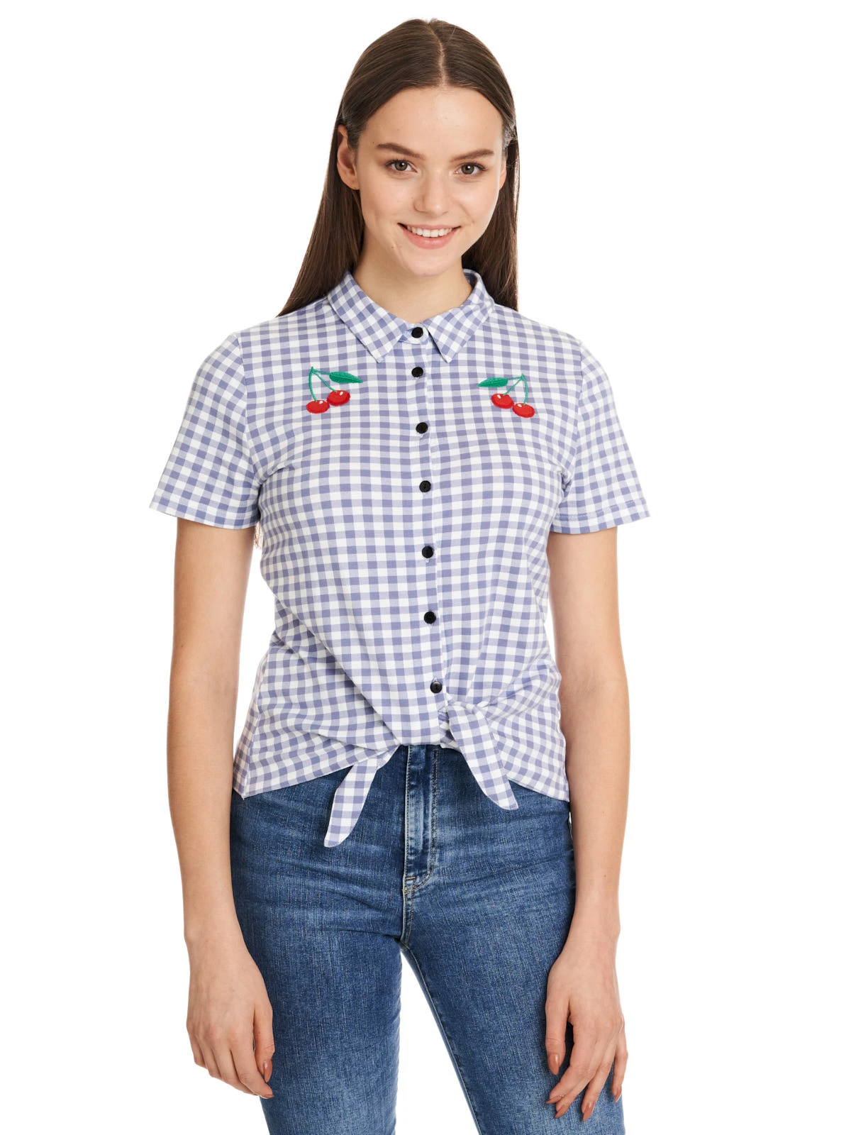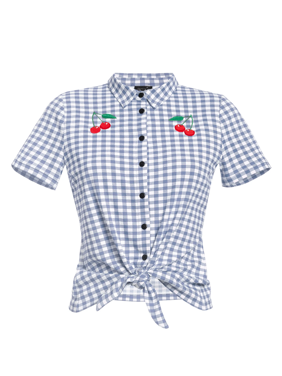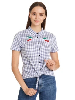 Candy meets Pussy Deluxe! Die sĂĽĂźe Pussy Deluxe Kurzbluse ist aus einem angenehmen Baumwollmaterial mit Elasthananteil. Sie ist figurbetont geschnitten und wird vorne zusammengeknotet, so dass die Bluse minimal Bauchfrei wird. Sie hat einen Hemdkragen, kurze Arme und eine durchgängie Knopfleiste. Der Druck zeigt ein sĂĽĂźes Karomuster in verschiedenen blautönen. Das Highlight bilden zwei aufgestickte Kirschen im vorderen Schulterbereich. Die ‚Blue Plaid Short Blouse‘ ĂĽberzeugt mit ihrem tollen Schnitt und den sommerlichen Farben und bringt so ein bisschen Sonne in unseren grauen Alltag. Sie passt perfekt zur 7/8 Jeans und hellen Sneakern. Wer lieber Mädchenfarben hat, der findet tolle Alternativen in der ‚Lightpink‘ oder der ‚Red‘ Variante.