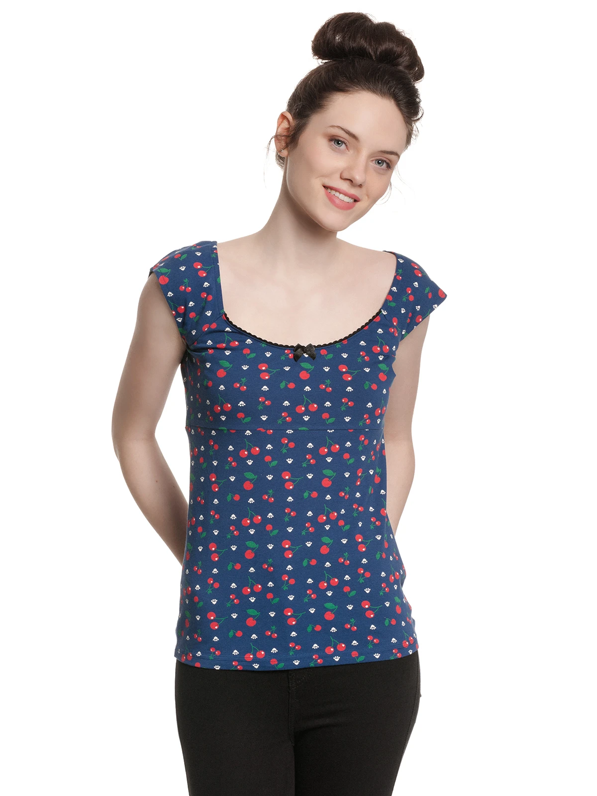 Das sĂĽĂźe Damen Shirt ist aus einem angenehmen Baumwoll-Elasthangemisch. Es ist figurbetont geschnitten und hat kurze Arme sowie einen groĂźen runden Ausschnitt, der mit einer schwarzen Litze und einer kleinen Satinschleife verziert ist. Eine Unterbrustnaht sorgt fĂĽr einen guten Sitz. Der Druck zeigt Kirschen und Herz-Katzentatzen auf blauem Grund. Ein weiteres liebevolles Detail ist die Spiegelung auf der Kirsche, die eine Herzform hat. Ein absolut tolles Shirt, das noch dazu sehr figurschmeichelnd wirkt. Das sĂĽĂźe ‚Cat Paws & Cherries Girl‘ Shirt ist nicht nur was fĂĽr eingeschweiĂźte Pussy Deluxe Fans, sondern auch fĂĽr alle, die Mode lieben. Der Kirschen Print ist frisch und macht Lust auf den Sommer. Trotz des figurbetonten Schnittes trägt es nicht auf und ist damit der perfekte Begleiter fĂĽr den FrĂĽhling. Dieses Shirt wird garantiert in unserem Kleiderschrank wandern.