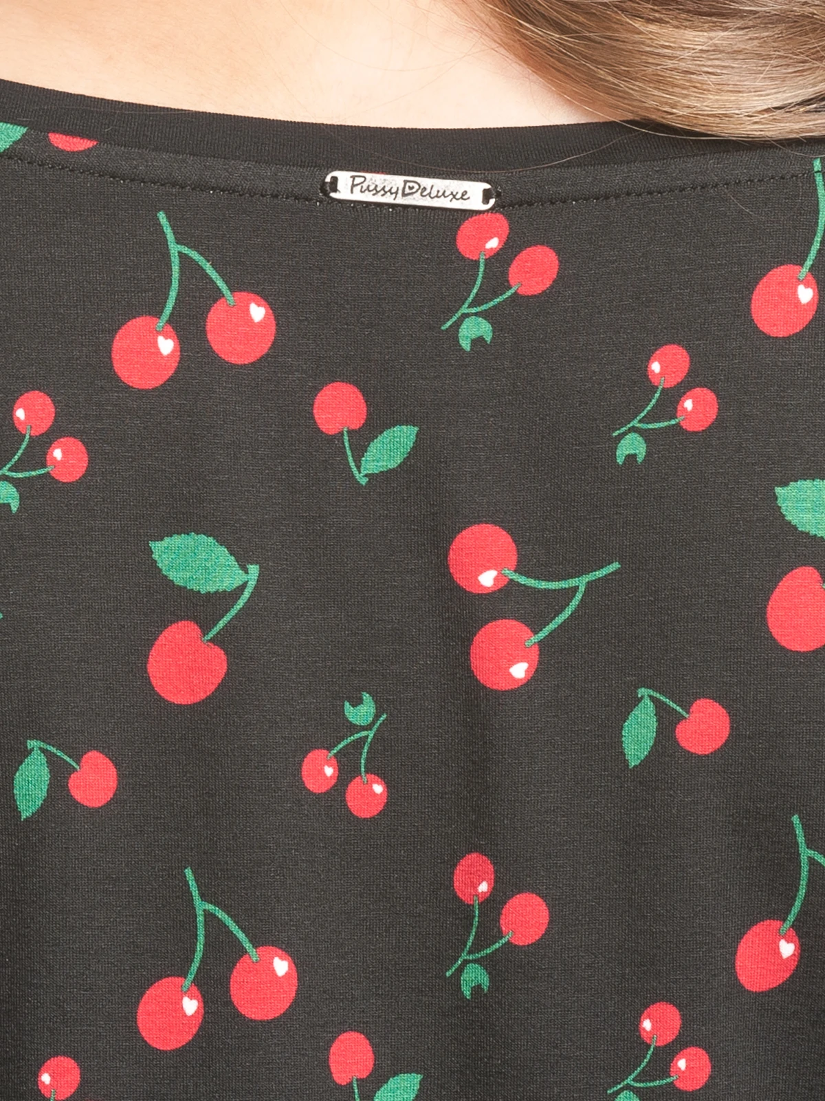 Sweet Cherry Deluxe. Das süße Pussy Deluxe Shirt besteht aus einem weichen und angenehmen Viskosematerial mit Elasthananteil. Es ist locker und gerade geschnitten, hat kurze Ärmel und einen runden Halsausschnitt. Der Druck besteht aus roten Kirschen. Absolut bezaubernd und ein perfekter Begleiter für alle Kirschenliebhaberinnen. Das Cherries Loose Shirt wirkt dank seiner Passform leger und locker. Es passt perfekt zu schwarzen Skinnyjeans und roten Pumps. Ein schwarzer Longcardigan lässt den Look noch lässiger erscheinen.
