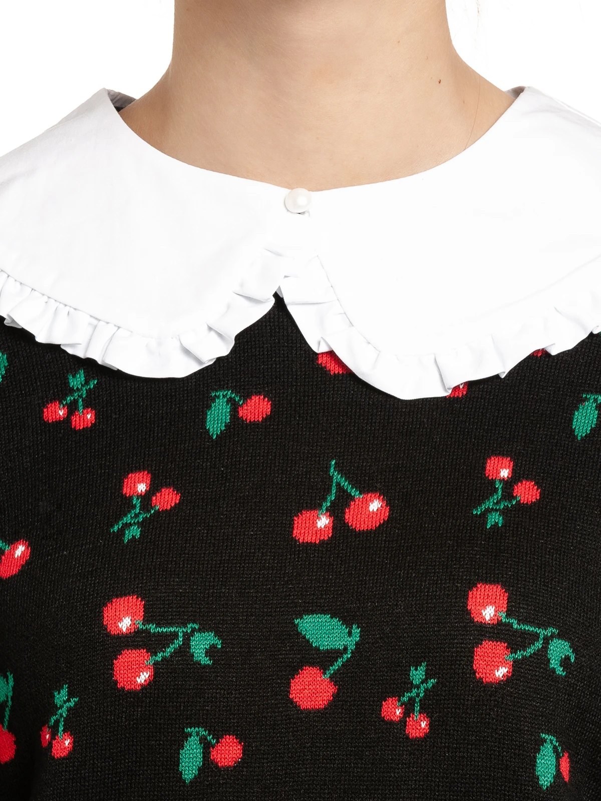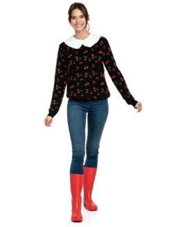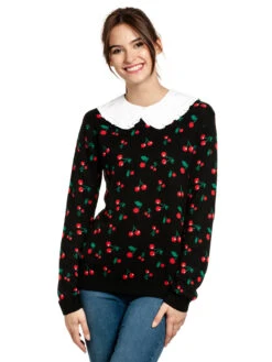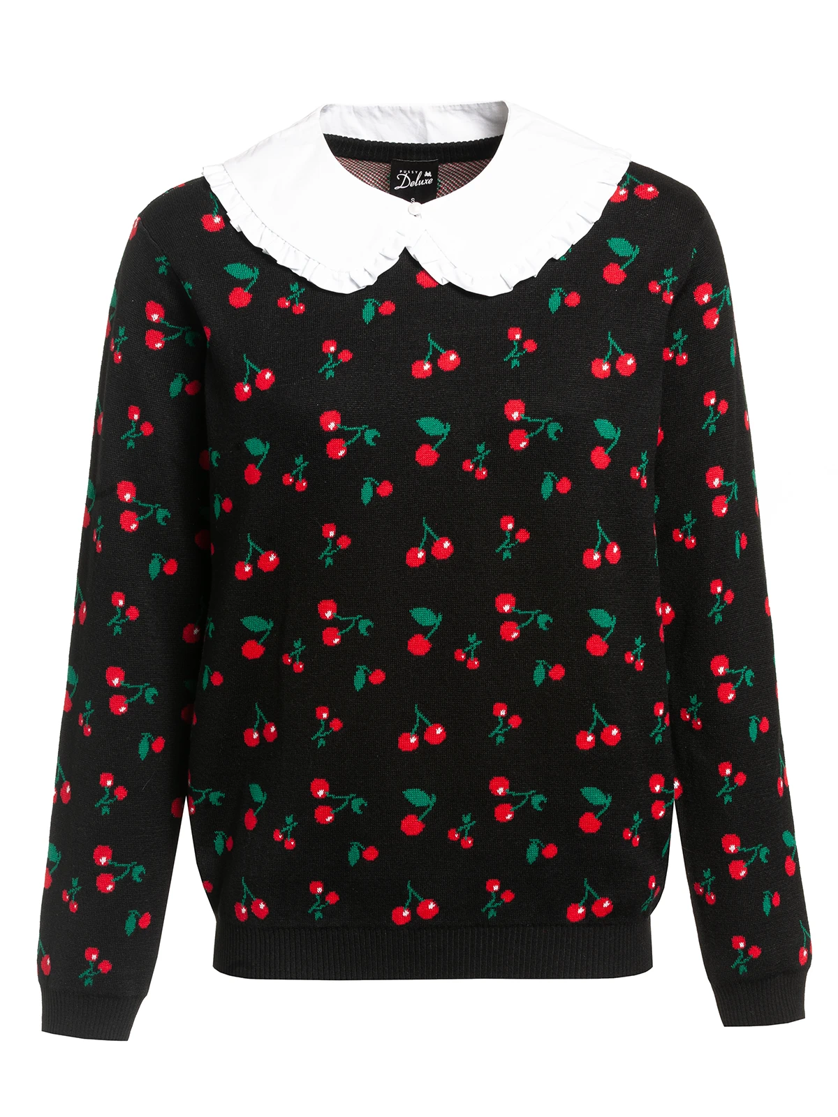 Der mega coole Pussy Deluxe Pullover ist aus einem angenehmen Materialmix aus Baumwolle und Polyacryl. Der abnehmbare Kragen ist aus einem Baumwollmaterial. Der Pullover hat lange Arme und einen runden Halsausschnitt, der in einen weißen großen Bubikragen übergeht. Er hat eine gerade Passform und wird an den Armen sowie am unteren Saum mit einem eingestrickten Bündchen abgeschlossen. Das Jacquard Kirschenmuster wurde ebenfalls eingestrickt. Der Bubikragen ist abnehmbar und kann auch mit anderen Oberteilen kombiniert werden. Der ‚Cherries Knit Pullover‘ ist ein toller Alltagsbegleiter und kann hervorragend mit einer Skinny Jeans uns Ankle Boots kombiniert werden.