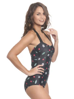 Ob Strandhase oder Badenixe – mit der Pussy Deluxe Badekollektion kommt jeder auf seine Kosten Der supersĂĽĂźe Badeanzug hat einen tollen allover Druck mit Kirschen und weiĂźen BlĂĽten. Breite Träger fĂĽhren vom Herzförmigen Ausschnitt nach hinten und werden im Nacken gebunden. Die Cups sind leicht gefĂĽttert und zaubern der Trägerin ein tolles Dekolletee. Ein tolles Modeaccessoires fĂĽr jede Generation. BadeanzĂĽge – in diesem Jahr so trendy wie nie zuvor. Sie schmeicheln der weiblichen Silhouette und können nicht nur zum Schwimmen getragen werden. Zu Röcken oder unter Cardigans sind sie absolut in Mode. So auch der ‚Cherry Blossom‘ Badeanzug von Pussy Deluxe, der mit seinem frechem Druck absolut ĂĽberzeugt.