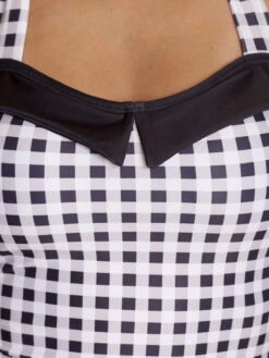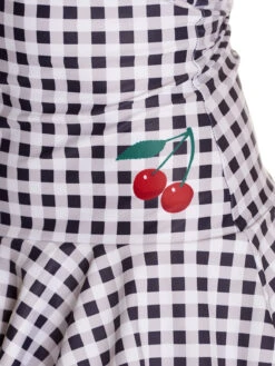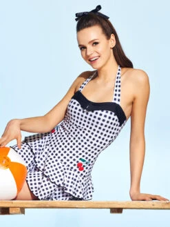 Badenixen aufgepasst – die neue Pussy Deluxe Badekollektion ist draußen Kariert starten wir in die Badesaison. Der ‚Collar Plais‘ Badeanzug kombiniert süße schwarze und graue Karos mit weißem Polyesterstoff. Breite Träger können im Nacken zusammengebunden werden. Ein kleiner schwarzer Kragen am herzförmigen Ausschnitt, Raffungen und gefütterte Cups sorgen für ein schönes Dekolletee. Im Bauchbereich gibt es ebenfalls Raffungen und gelegte Falten, die kleine Problemzonen optimal kaschieren. Kleine süße Kirschappliaktionen sind links und rechts auf Hüfthöhe aufgedruckt und sind das Highlight. Der Badeanzug geht direkt in einen Rock über, der aus zwei Lagen besteht. Das ‚Schwimmkleidchen‘ ist ein Top-Begleiter für alle modebewussten Ladys. Wer glaubt, Badeanzüge sind nichts für junge moderne Frauen, der hat unsere Pussy Deluxe Bademodenreihe noch nicht gesehen. Punkte, Kirschen, Karos oder Raffungen? Das alles wird bei uns mit figurfreundlichen und schmeichelnden Schnitten kombiniert. Wir wünschen euch viel Spaß am Strand, am Pool oder einfach nur auf der Liegewiese.