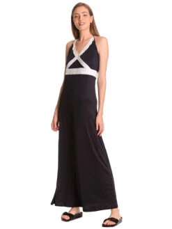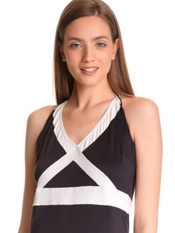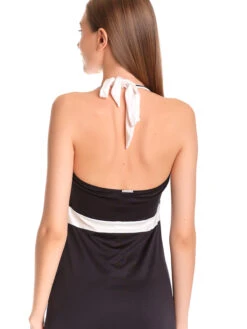 Badenixen aufgepasst! Das coole Pussy Deluxe Beachdress ist aus einem leichen Polyestermaterial mit Elasthananteil. Es ist figurbeont geschnitten, der Rockteil verläuft in einer sanften A-Linie. Das Kleid hat einen V-Ausschnitt und breite Träger, die im Nacken zusammengebunden werden. Sowohl der Ausschnitt als auch eine breite Unterbrustnaht sind aus einem cremefarbenen Stoffeinsatz und heben sich somit farblich vom schwarzen Kleid ab. Das ‚Criss Cross‘ Neckholderkleid ist ein toller Begleiter für den Strand oder den Pool. Ob im eigenen Garten oder im Schwimmbad, kombiniert mit ein paar tollen Wedges bist du sicherlich der Hingucker. Durch das Material, dass einem Badeanzug gleicht, bist du zudem gut vor dem Wasser geschützt und selbst bei kleinen oder großen Spritzern im Handumdrehen wieder trocken. Wem das Beachdress eine Nummer zu unauffällig ist, der findet tolle Alternativen im ‚Classic Pink Dotties‘, ‚Vintage Rose‘ oder auch ‚Wild Cherry‘ Beachdress. Ganu nebenbei kannst du noch etwas für die Umwelt tun, denn das Beachdress ist aus recyceltem Plastik. Länge in Gr. S ohne Träger ca. 135 cm.