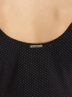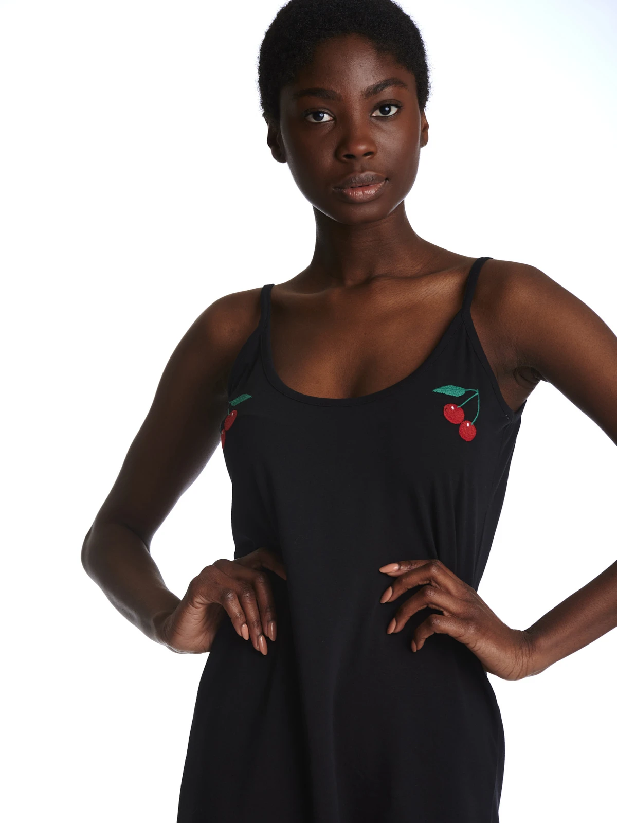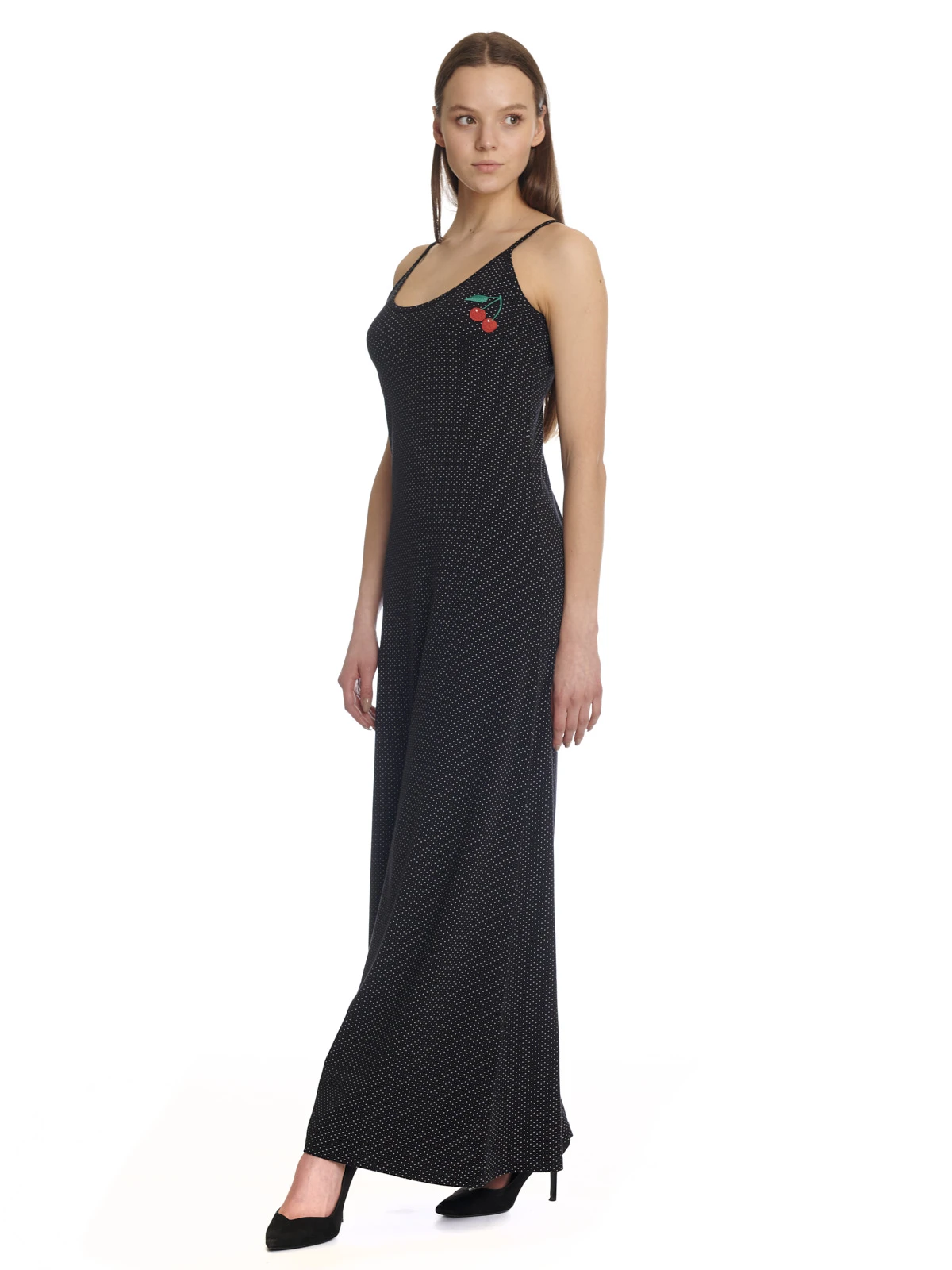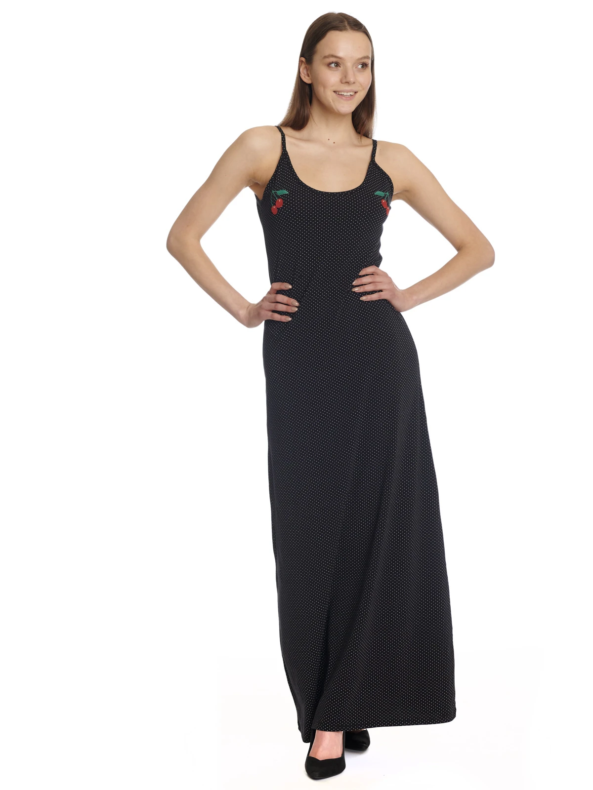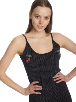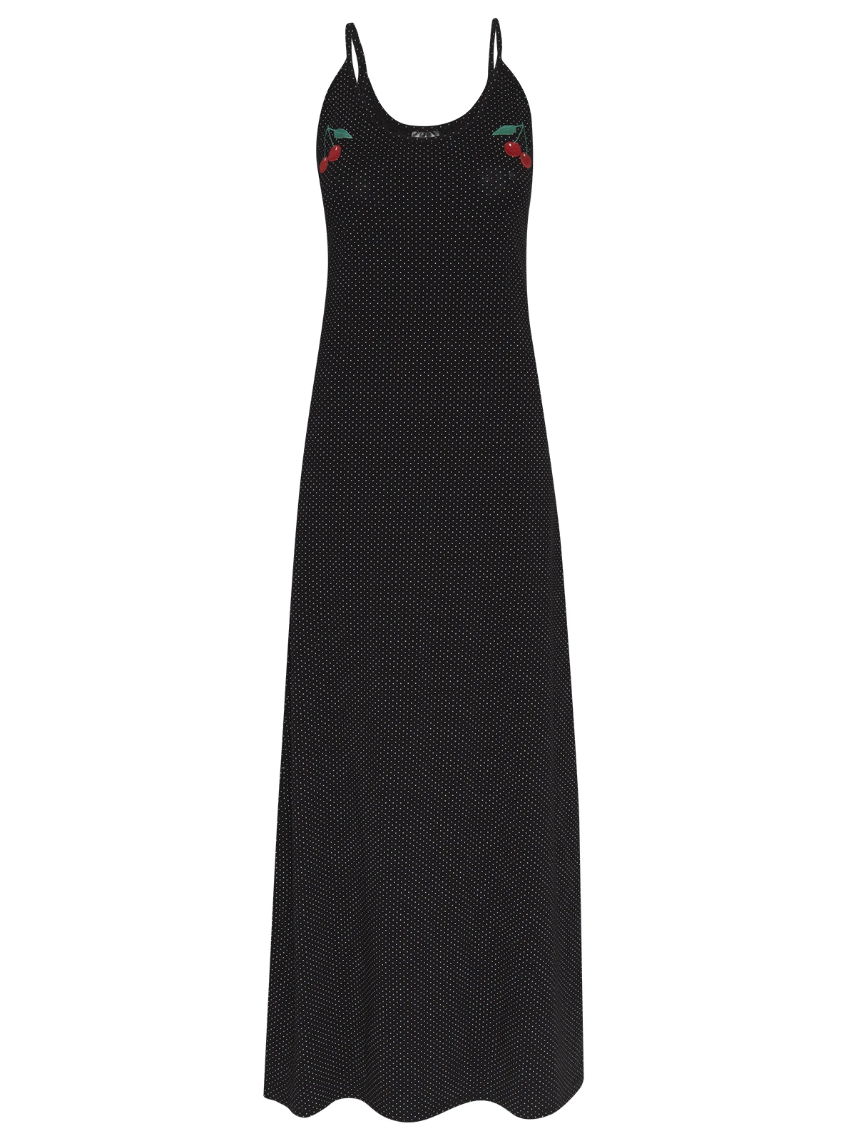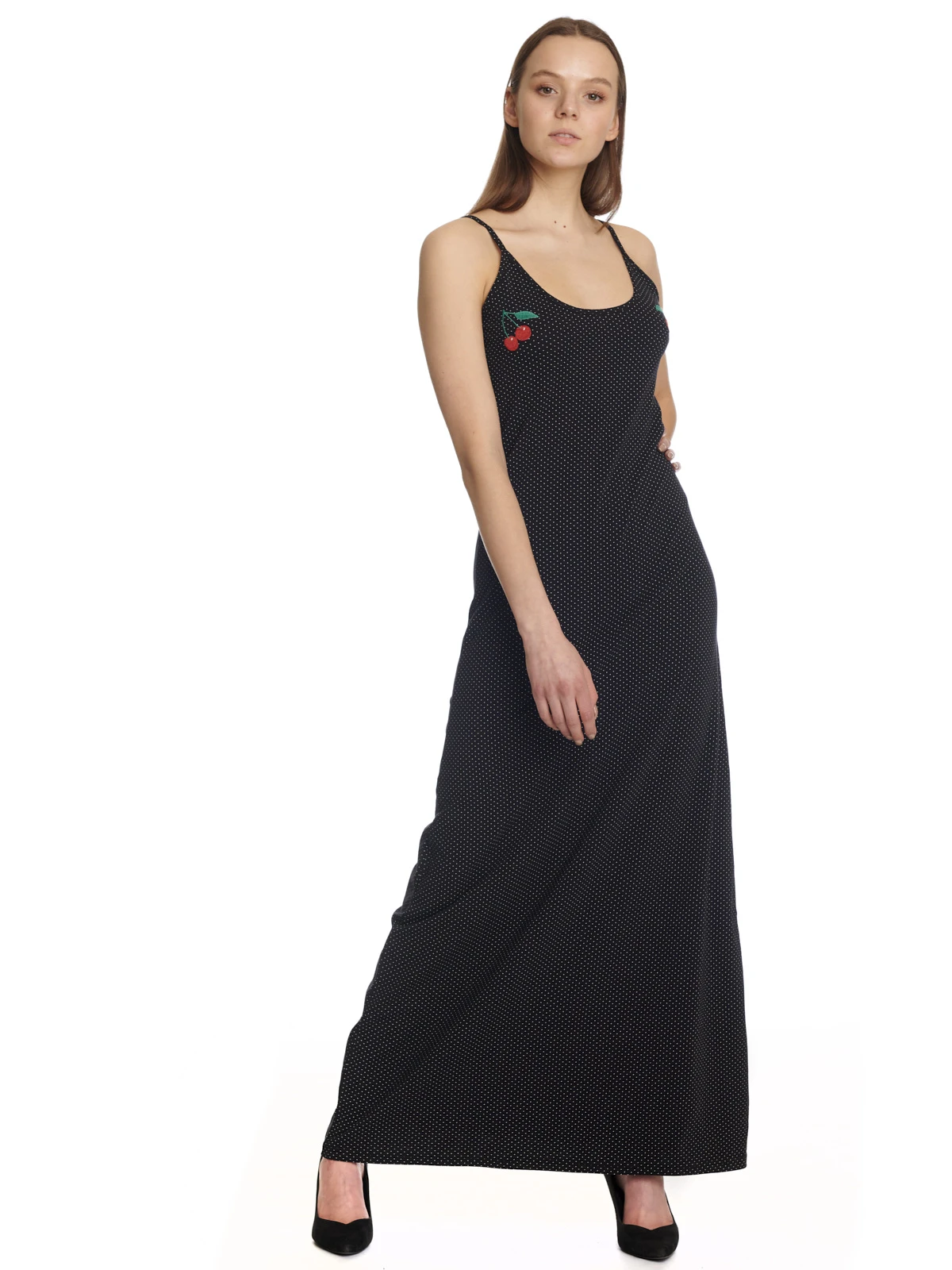 Modisch schick trifft Pussy Deluxe Das mega coole Pussy Deluxe Kleid ist aus einem angenehmen Baumwollmaterial mit Elasthananteil. Es hat einen gerade Passform, einen groĂźen runden Halsausschnitt und dĂĽnne Träger. Zwei aufgestickte Kirschen links und rechts im Brustbereich bilden das Highlight des Kleides. Das Kleid ist etwa knöchellang. Kleine weiĂźe Punkte zieren den schwarzen Stoff. Das ‚Dotties Cherry Long Dress‘ ist ein toller Begleiter fĂĽr lange Sommertage. Ob Gartenparty oder Einkaufsbummel. Kombiniert mit leichten Turnschuhen und einer Jeansjacke kanns auch schon losgehen. Länge Größe S ohne Träger ca. 135 cm.