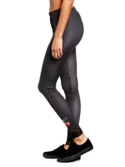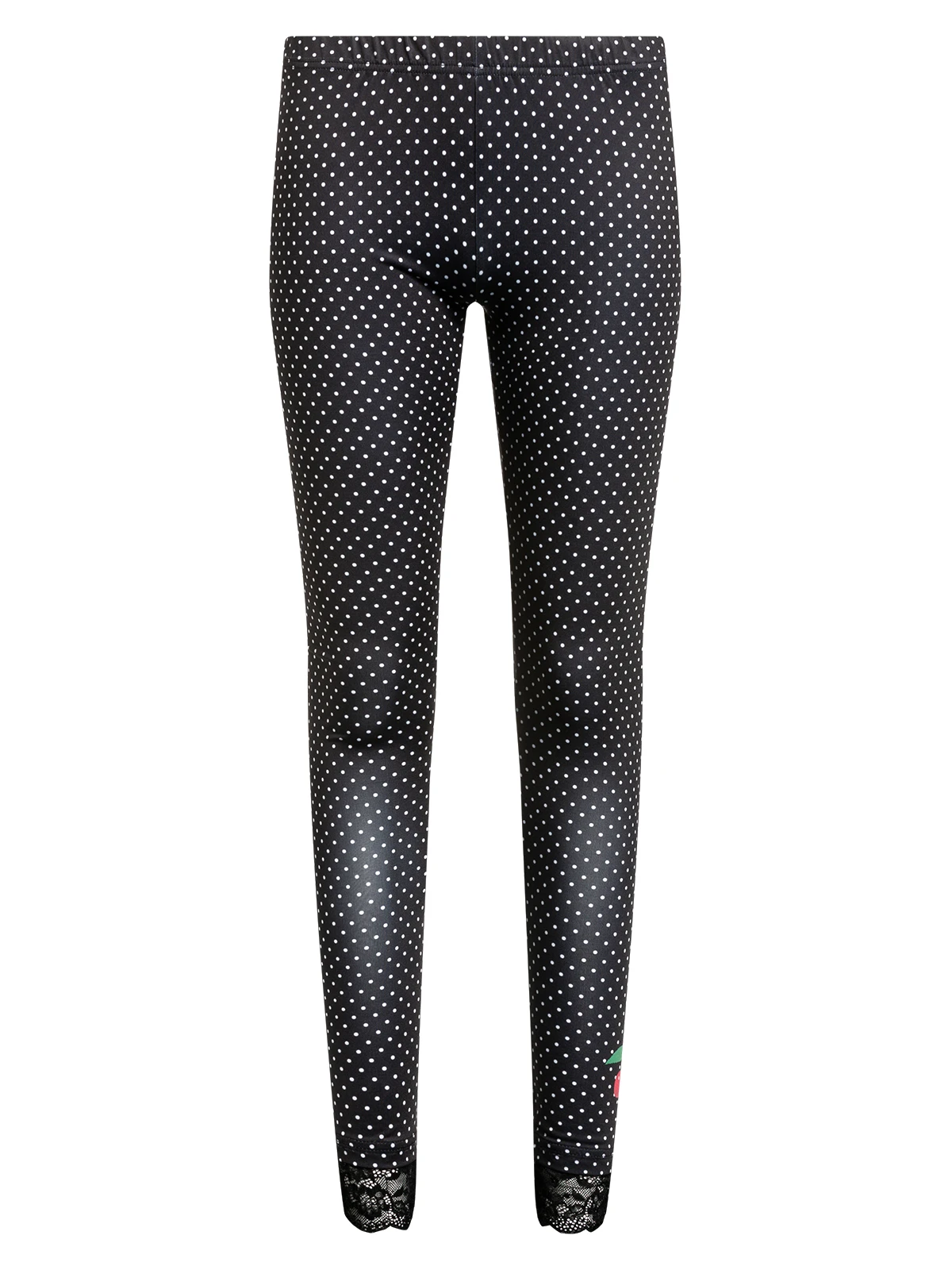 Neue Styles online – der FrĂĽhling wird bequem! Die sĂĽĂźe Pussy Deluxe Leggings ist aus einem angenehmen Polyestermaterial mit Elasthananteil. Sie hat einen breiten Gummibund fĂĽr einen hohen Tragekomfort. Die langen Hosenbeine sind figurbetont und enganliegend. Die langen Hosenbeoine werden mit einer BordĂĽre aus schwarzer transparenter Spitze abgeschlossen. Der Druck zeigt weiĂźe Micropunkte auf schwarzem Stoff. Eine kleine Kirsche ziert die linke untere Seite. Die ‚Cherries‘ Leggings ist eine mega sĂĽĂźe frĂĽhlingshafte Leggings, die garantiert fĂĽr gute Laune sorgt, in dem sie dein Outfit aufpeppt. Du kannst sie mit Sneakern und einen Longshirt kombinieren, natĂĽrlich sieht auch ein Kleid dazu spitze aus. Innenbeinlänge in Gr. S ca. 74 cm.