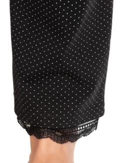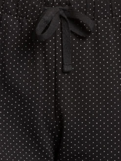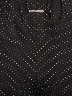 Die süße Pussy Deluxe Pyjamahose ist aus einem leichten Baumwollmaterial mit Elasthananteil. Sie ist gerade geschnitten und hat einen breiten Gummibund, der für einen hohen Tragekomfort sorgt. Ein schwarzes Bindeband dient der zusätzlichen Weitenregulierung. Die langen Hosenbeine werden mit einer Bordüre aus schwarzer transparenter Spitze abgeschlossen. Der Druck zeigt kleine weiße Punkte auf schwarzem Stoff. Die ‚Dootes Pyjama Pants‘ ist nicht nur als Schlafhose geeignet, sondern macht auch mit einem Shirt oder Pullover auf dem Sofa eine gute Figur. Ein paar kuschelige Socken dazu und der nächste Filmeabend kann kommen. Innenbeinlänge in Gr. S ca. 78 cm.