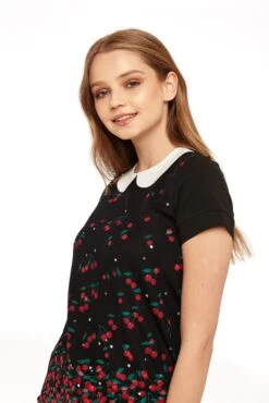 Dieses wunderschöne Shirt ist aus einem tollen Baumwoll-Elasthan-Gemisch. Der eingearbeitete Einsatz ist aus angenehmen Polyester. Das Shirt ist locker und gerade geschnitten, hat kurze Arme und einen runden Halsausschnitt mit einem weißen Bubikragen. Der Aufdruck auf der Vorderseite zeigt Kirschen und kleine weiße Herzchen, die von oben nach unten Fallen und sich im Saumbereich sammeln. Der Rücken ist komplett schwarz. Ein süßes Shirt dass frech und zugleich unschuldig wirkt.