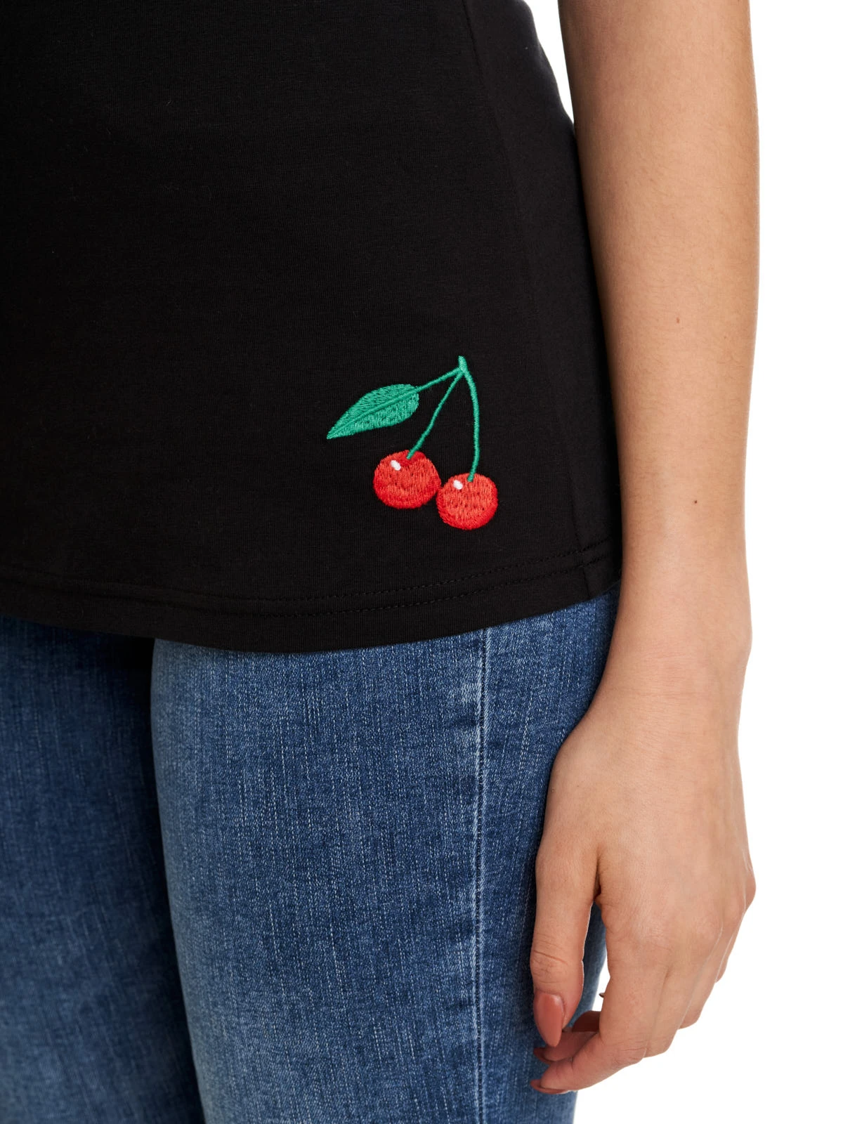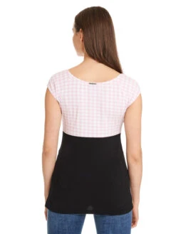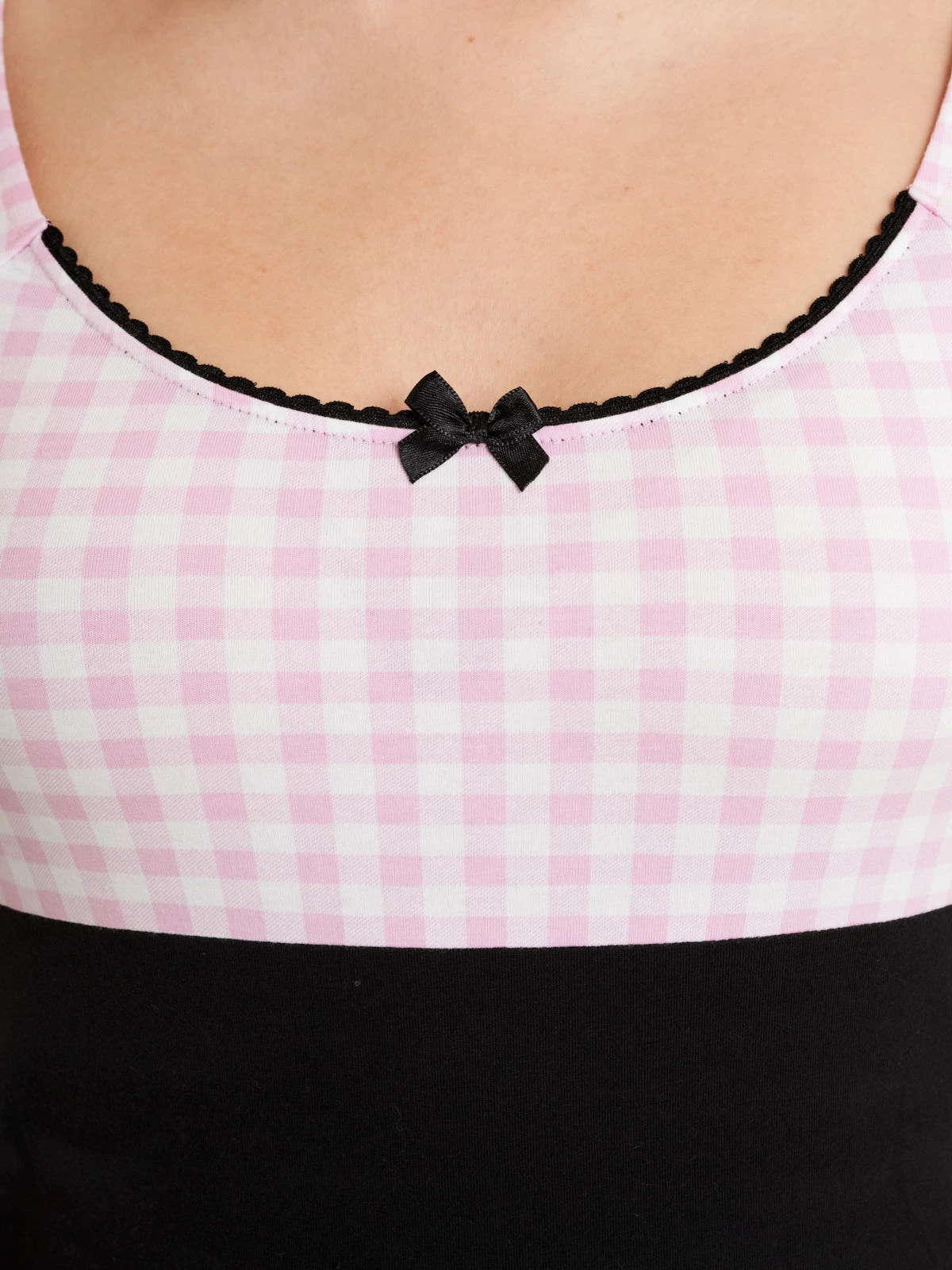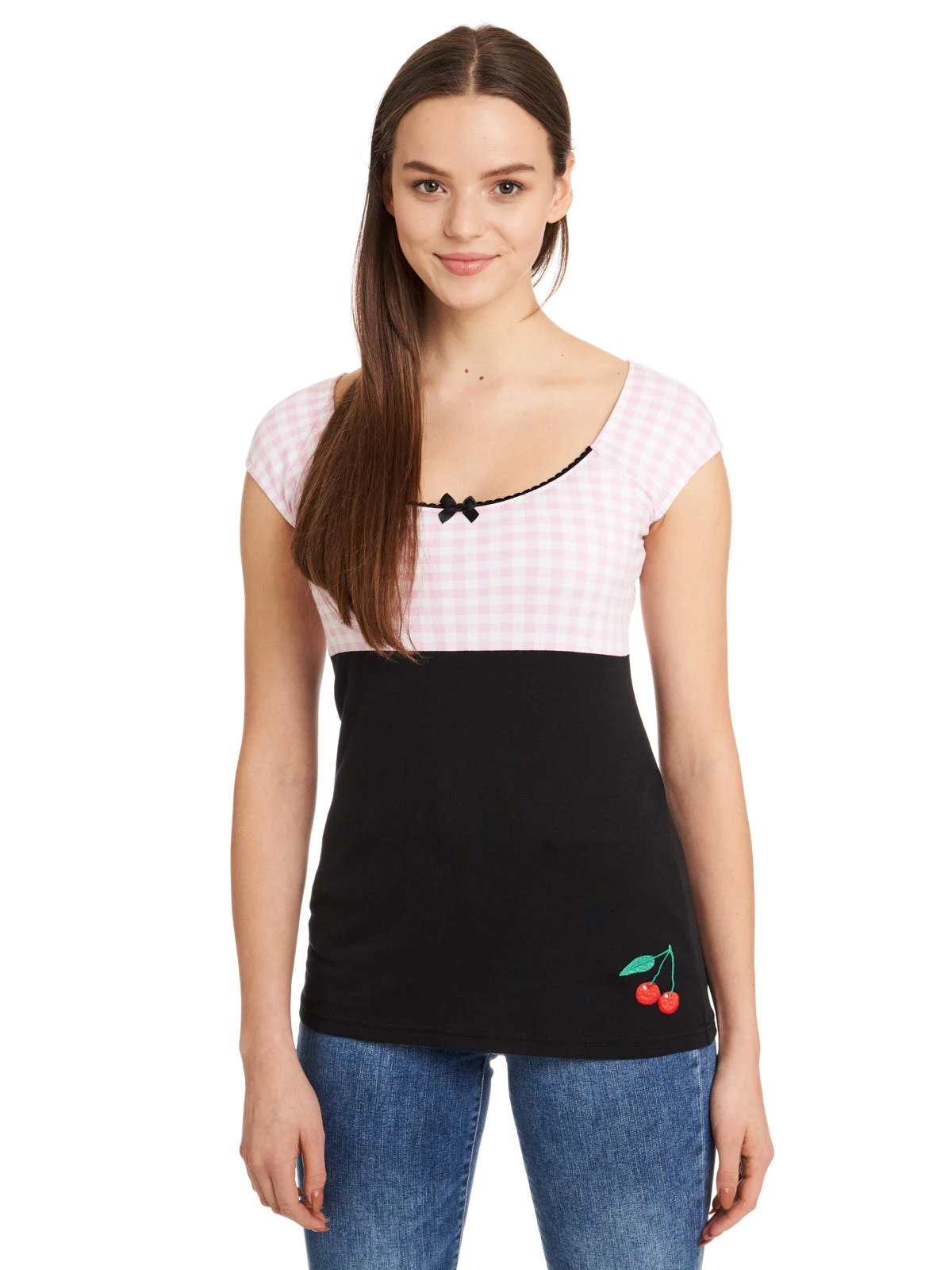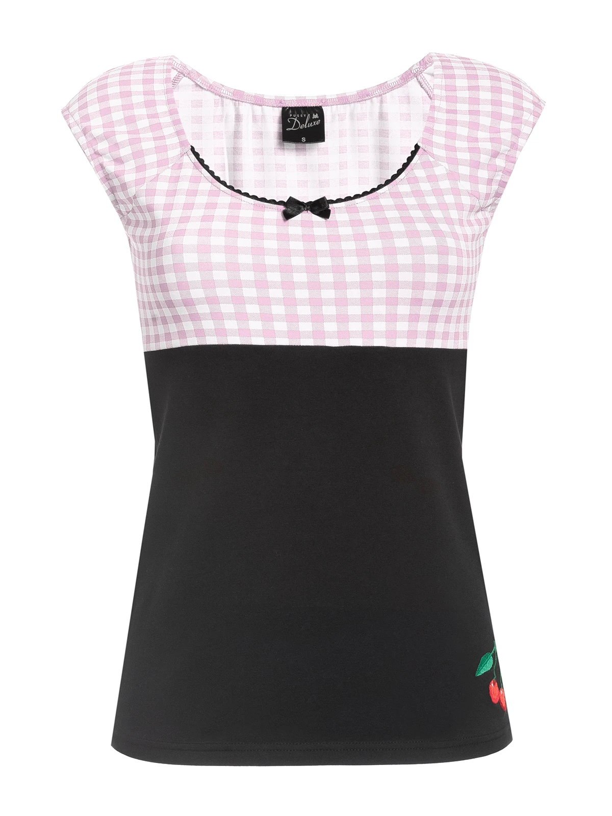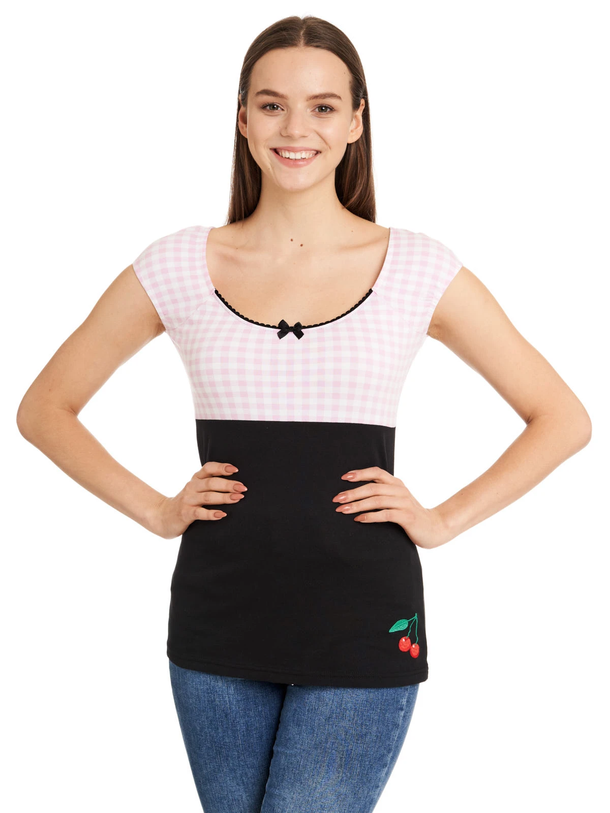 Candypower mit Pussy Deluxe Das süße Pussy Deluxe T-Shirt ist aus einem angenehmen Baumwollmaterial mit Elasthananteil. Es ist figurbetont geschnitten und hat kurze Arme. Der große runde Halsausschnitt ist mit einer schwarzen Litze und einer schwarzen Satinschleife verziert. Der obere Shirtbereich ist bis zur Unterbrustnaht aus rosafarbenen Karos, das restliche Shirt ist schwarze. Auf der linken unteren Seite ist eine aufgestickte Kirsche, die das Gesamtbild abrundet. Ein tolles Basic, dass sofort an Zuckerwatte erinnert. Das ‚Lightpink Plaid Evie Shirt‘ passt super zu Jeans und weißen Sneakern. Du kannst es sowohl im Büro als auch im Homeoffice tragen – es wird dir definitiv gute Laune bereiten.
