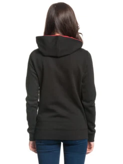 Dieser Damen Schalkragenhoodie besteht aus einem angenehmen Baumwoll-Polyester-Mix in Schwarz. Er ist normal geschnitten, hat einen hochgeschlossenen Schalkragen mit einer Kapuze und lange Ärmel. Die Kapuze ist rot gefüttert und die Ärmel enden in gerippten Bündchen. Eine Känguru-Tasche vorne komplettiert das Design.