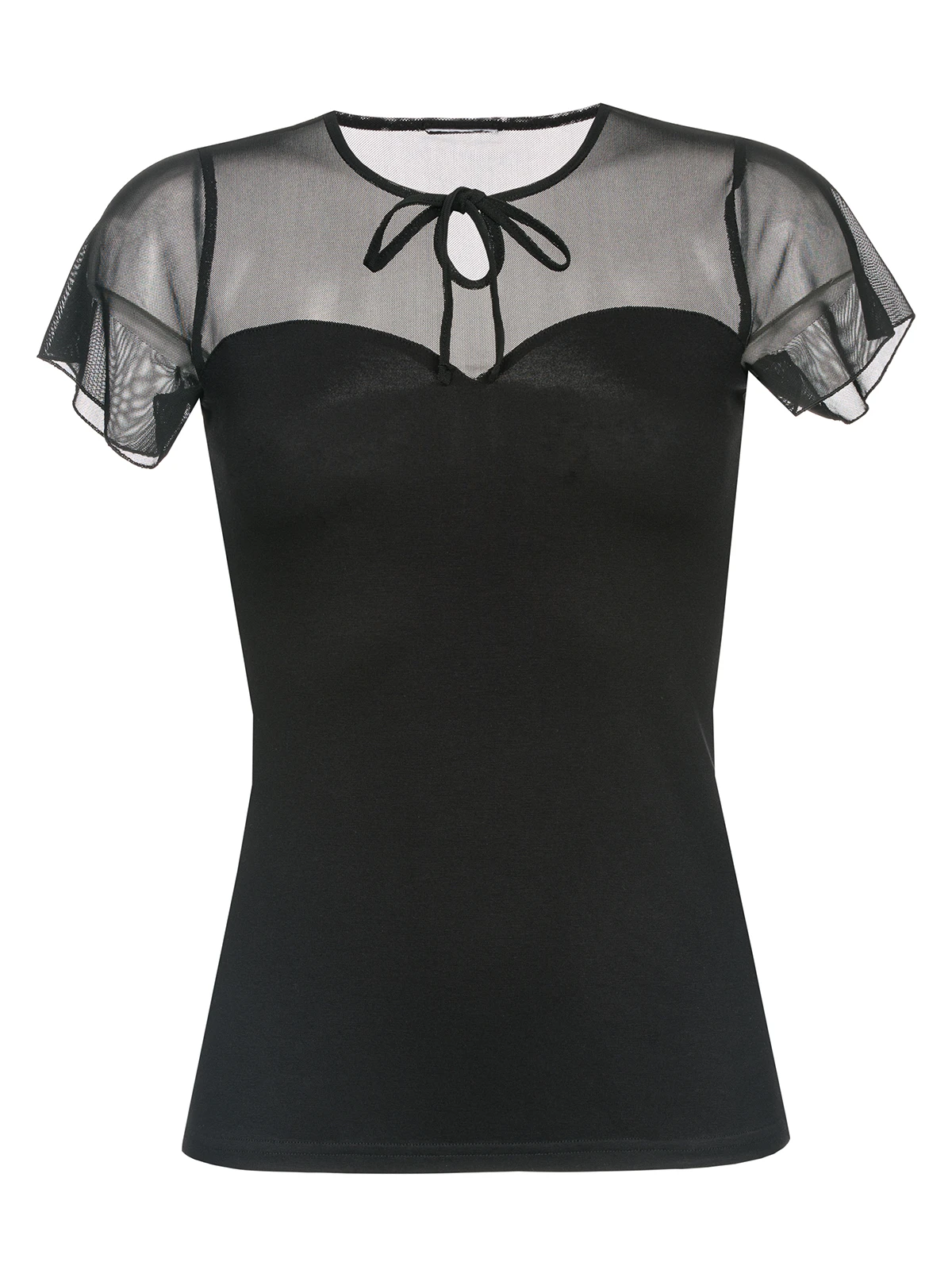 transparenter Schulterbereich Schlüsselloch-Detail im Dekolleté Rundhals-Ausschnitt, Mit dem Lovely Chic Shirt von Pussy Deluxe bist du selbst auf der edelsten Party angemessen gekleidet. Das obere Drittel des schwarzen T-Shirts ist transparent, ein Schlüsselloch-Detail lenkt die Aufmerksamkeit auf ein schön geformtes Dekolleté, das durch den bogenförmigen Abschluss in Szene gesetzt wird. Ein figurbetonter Schnitt und hauchzarte Schmetterlingsärmel ergänzen den romantischen Look.