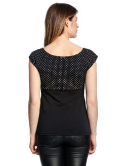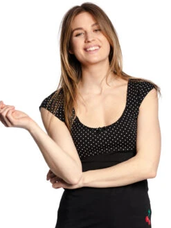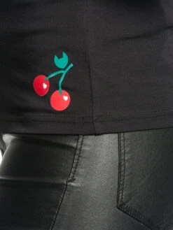 Das schicke Pussy Deluxe Shirt überzeugt mit schlichter Eleganz, süßen Details und einem tollen Materialgemisch aus Baumwolle und Elasthan. Es ist figurbetont geschnitten, hat kurze Arme und einen großen runden Halsausschnitt, der mit einer schwarzen Litze und einer kleinen Satinschleife verziert ist. Der komplette obere Bereich bis zu Unterbrustnaht ist mit kleine weißen Punkten, also Polka-Dots bedruckt, das restliche Shirt ist schwarz. Auf der linken unteren Seite sind zwei aufgedruckte Kirschen. Die Spiegelung wird jeweils als Herz dargestellt. Ein grünes Blatt in Form eines Katzenkopfes erinnert an die früheren Pussy Deluxe Modelle. Eine tolle Mischung, die Alt und Neu miteinander vereint. Das coole Shirt ist vielfältig kombinierbar. Es passt super gut zur angesagten Marlene Hose, aber auch zu Skinny Jeans und Longcardigan. Für welchen Style entscheidest du dich?