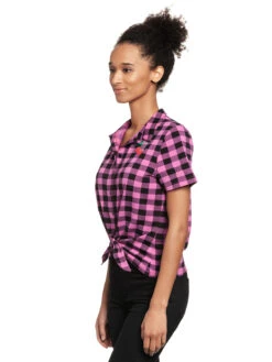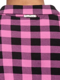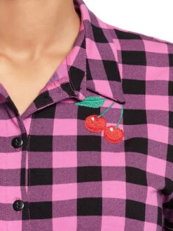 Farbenfroh in den Frühling – mit der neuen Pussy Deluxe Kollektion. Die süße Pussy Deluxe Kurzbluse ist aus einem angenehmen Baumwollmaterial mit Elasthananteil. Sie ist gerade geschnitten und hat kurze Arme. Der runde Halsausschnitt geht direkt in einen Blusenkragen über. Die Bluse hat eine durchgängige Knopfleiste und wird am unteren Saum mit zwei Bindebändern zusammengeknotet. So kannst du selbst entscheiden ob die Bluse mit dem Hosenbund abschließen soll oder ob sie Bauchfrei wird. Eine Kirschenstickerei ziehrt die linke vordere Schulter. Das Muster zeigt ein schwarzes Karomuster auf pinkem Stoff. Die ‚Pink Checkered Short Blouse‘ ist wie bereits die Vorgängermodelle mega bequem und sommerlich leicht. Du kannst sie hervorragend mit einer schwarzen Jeans und Sneakern kombinieren.