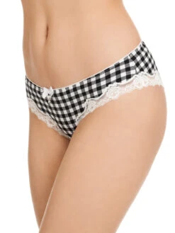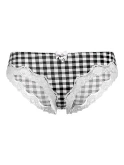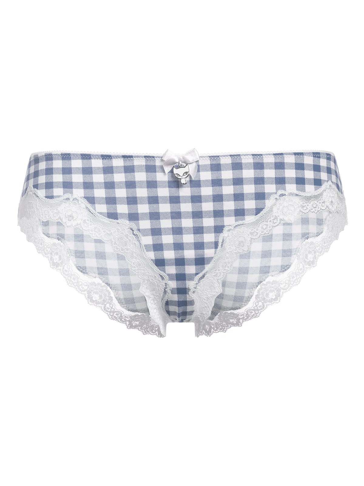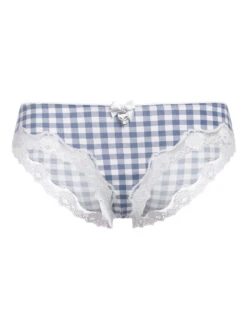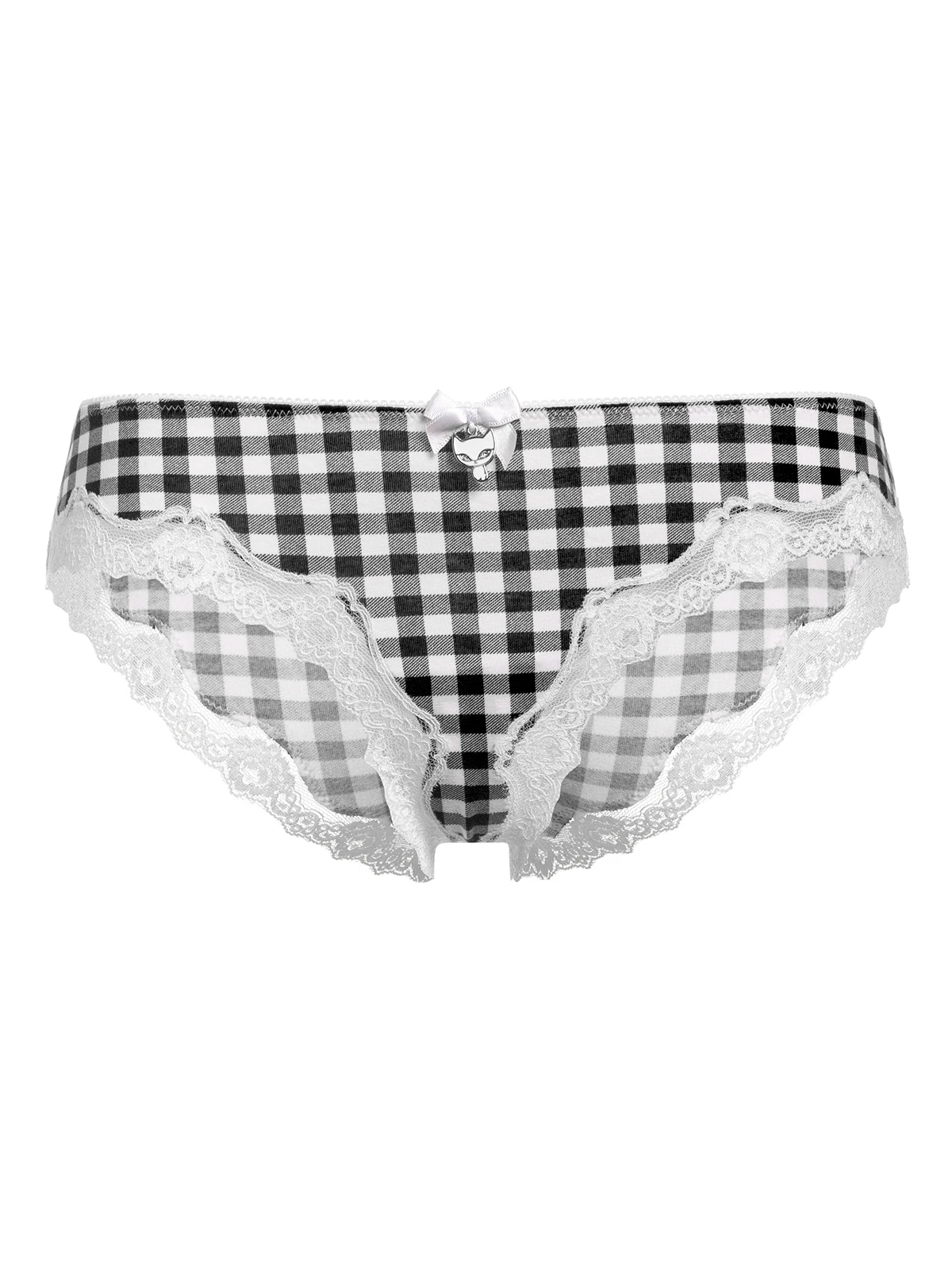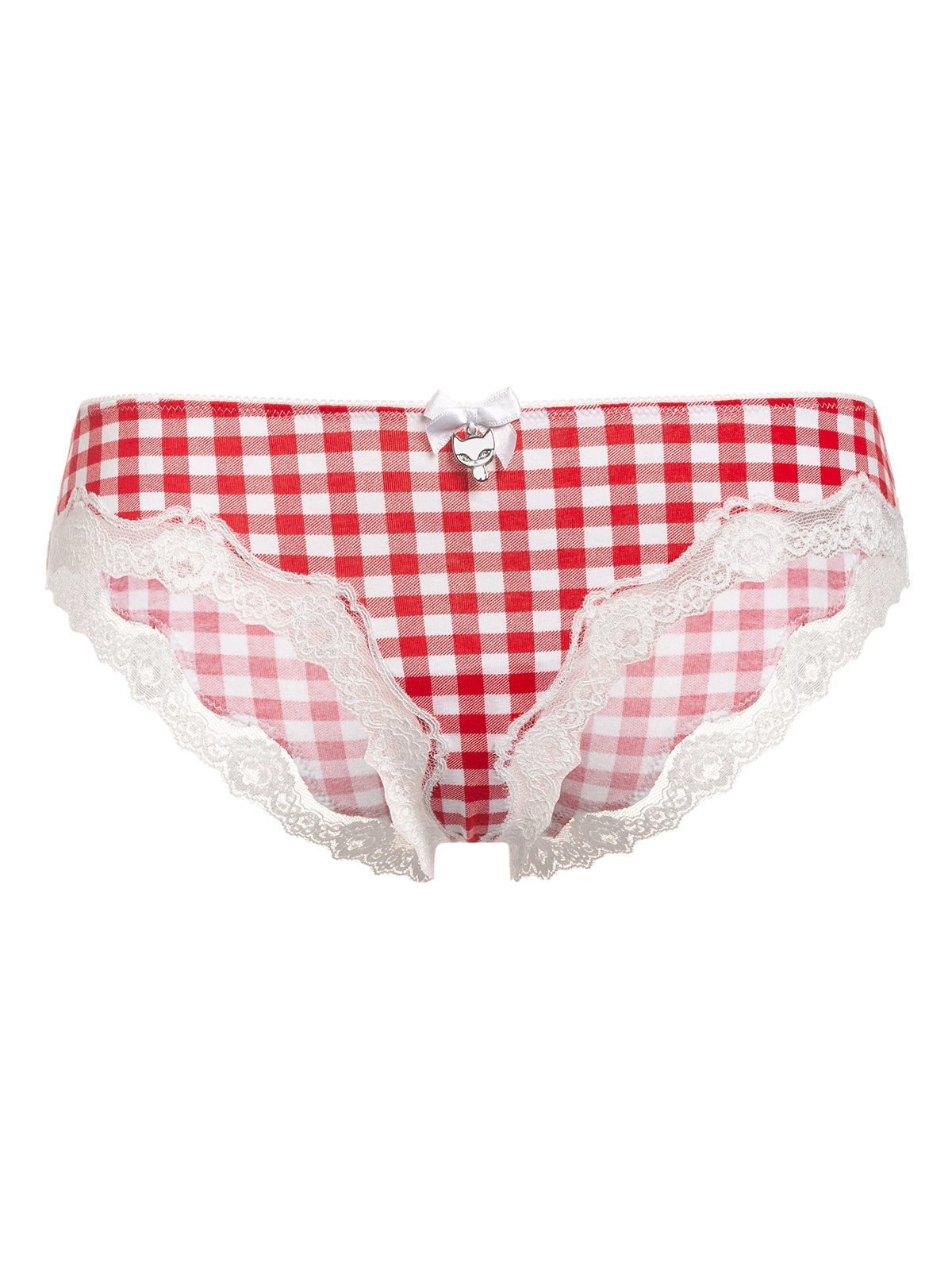 Pantie hoch 3 Das süße Pantyset besteht aus drei baugleichen Pantiehöschen in den Farben rot, schwarz und blau. Sie sind aus einem angenehmen Baumwollmaterial mit Elasthananteil. Die Panties haben einen bequemen Gummibund, der mit einer weißen Spitzenlitze, einem Metallanhänger in Katzenform sowie einer Satinschleife verziert ist. Die Beinausschnitte werden mit einer weißen transparenten Spitzenbordüre abgeschlossen. Die Pantie hat einen engen Sitz und trägt nicht auf. Der Druck zeigt ein Karomuster in rot, blau bzw. schwarz. Ein tolles Wäscheset, dass garantiert für Abwechslung im Alltag sorgt. Die Panties fallen etwas größer aus und können eine Nummer kleiner gekauft werden