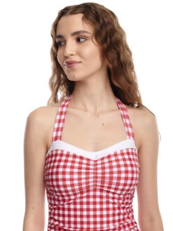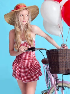 Kariert starten wir auch in diesem Jahr in die Badesaison. Der ‚Red Plaid‘ Badeanzug kombiniert verschiedenfarbene rote Karos mit weißem Polyesterstoff. Breite träger können im Nacken zusammengebunden werden. Ein kleiner weißer Kragen am herzförmigen Ausschnitt, Raffungen und gefütterte Cups sorgen für ein schönes Dekolletee. Im Bauchbereich gibt es ebenfalls Raffungen und gelegte Falten, die kleine Problemzonen optimal kaschieren. Der Badeanzug geht direkt in einen Rock über, der aus zwei Lagen besteht. Das Schwimmkleidchen ist ein Top-Begleiter für alle modebewussten Ladys. Wer glaubt, Badeanzüge sind nichts für junge moderne Frauen, der hat unsere Pussy Deluxe Bademodenreihe noch nicht gesehen. Karos, Schleifen und süße Verzierungen? Das alles wird bei uns mit figurfreundlichen und schmeichelnden Schnitten kombiniert. Wir wünschen euch viel Spaß am Strand, am Pool oder einfach nur auf der Liegewise. Der Badeanzug ist mit einem angenehmen Polyesterstoff unterfüttert und somit blickdicht.