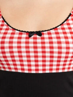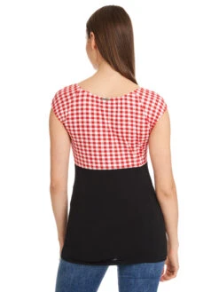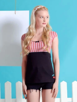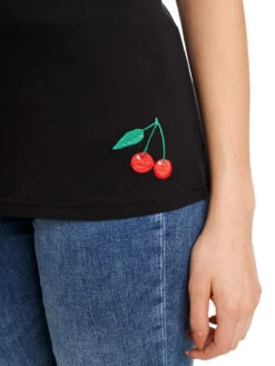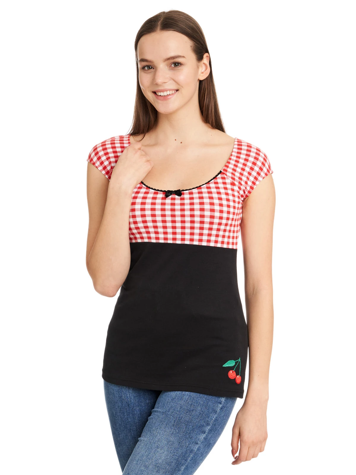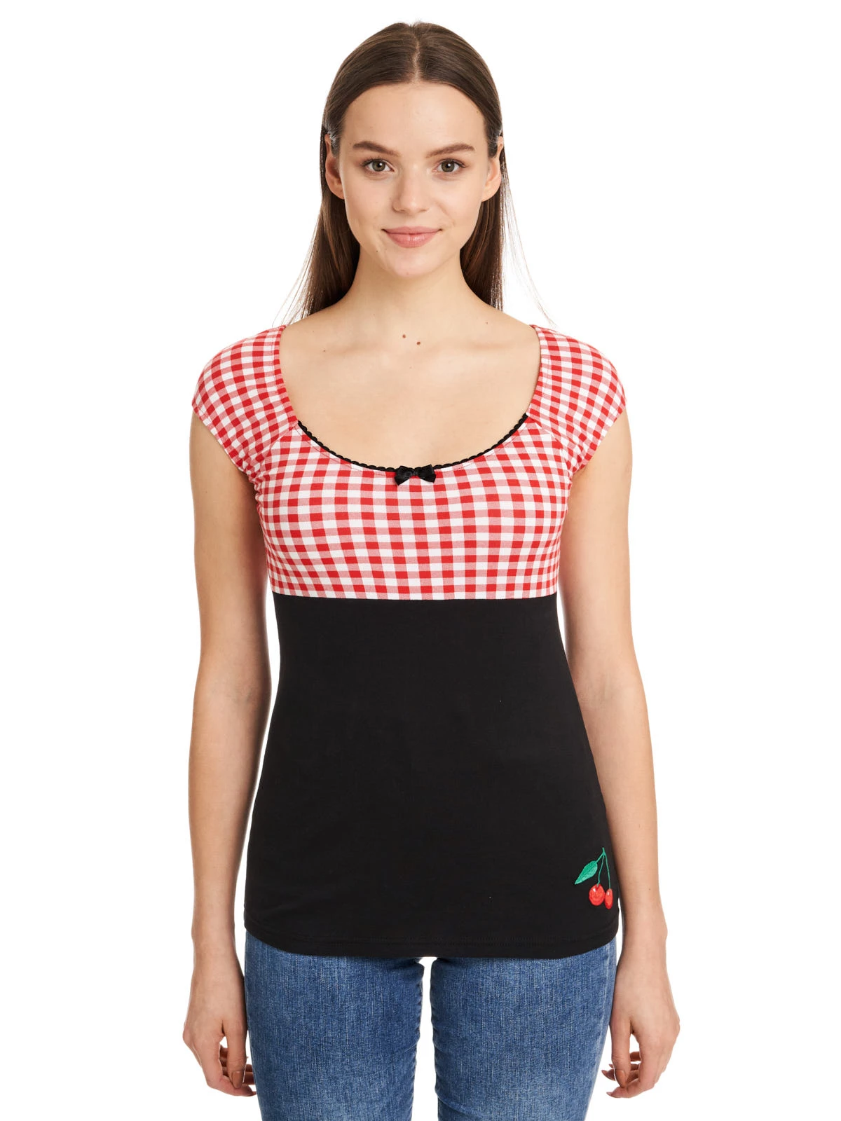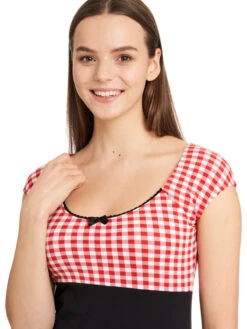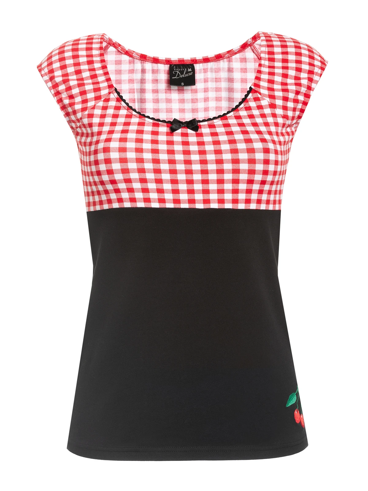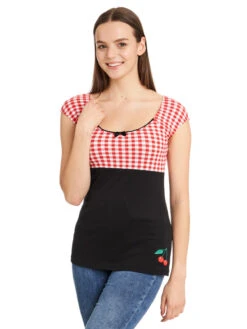 Candy-Style meets Summer Das süße Pussy Deluxe Shirt ist aus einem angenehmen Baumwollmaterial mit Elasthananteil. Es ist figurbetont geschnitten und hat kurze Arme. Der tiefe runde Halsausschnitt wird mit einer schwarzen Litze und einer schwarzen Satinschleife verziert. Der obere Shirtbereich ist bis zur Unterbrustnaht rotkariert, das restliche Shirt ist schwarz. Auf der linken unteren Seite ist eine Kirsche aufgestickt, die so das Gesamtbild süß abrundet. Ein tolles Basic, mit dem wir den Frühling kaum erwarten können. Das ‚Red Plaid Evie Shirt‘ passt hervorragend zu engen Bluejeans und Sneakern. Dadurcn wirkt es lässig und sportlich.