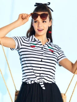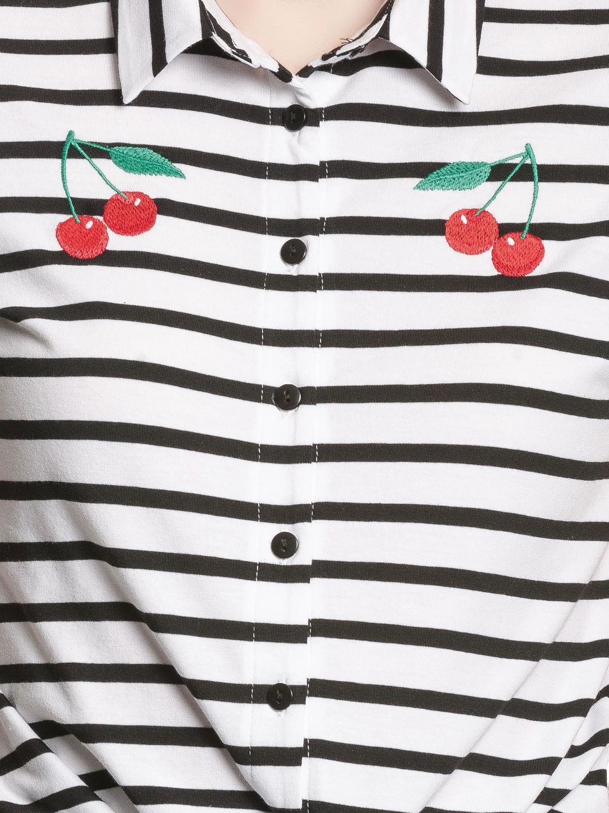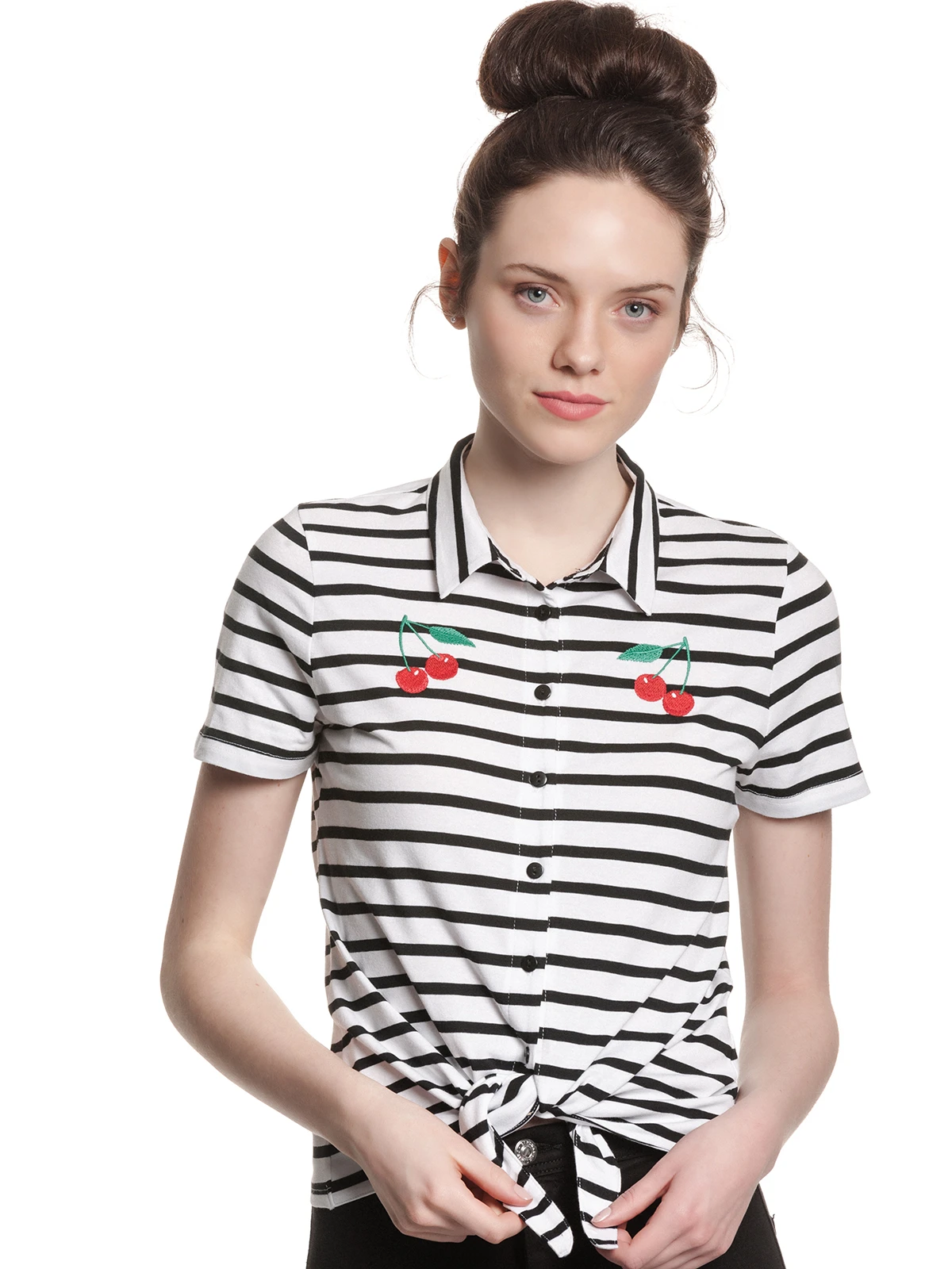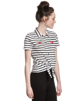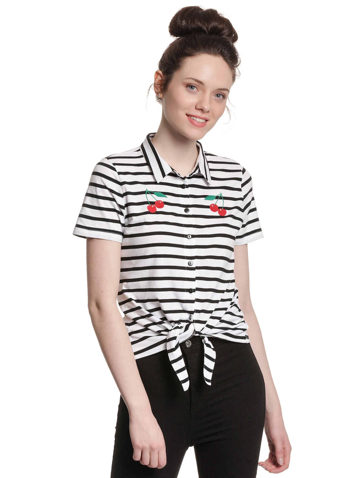 Die zauberhafte ‚Revival Stripes Short‘ Bluse ist aus einem angenehmen Baumwollmatermial mit Elasthananteil. Sie ist eng aber gerade geschnitten, hat eine durchgängige Knopfleiste sowie einen Hemdkragen. Die Bluse kann am untersten Knopf zusammengeknotet werden, sodass sie am Hosenbund aufliegt. Wer es gerne etwas gewagter trägt, kann sie weiter oben knoten und somit die bauchfreie Variante wählen. Aufgestickte Kirschen auf Höhe der vorderen Schulter runden das Gesamtbild ab. Ob Rockabilly oder Fashionista – hier kommt jeder auf seine Kosten. Schon im vergangenen Jahr war die ‚Revival Stripes‘ Reihe sehr erfolgreich und auch die Short Bluse muss sich hier nicht verstecken. Kombiniert werden kann sie mit einer schwarzen Caprihose und Wedges. Damit macht der Sonntagsspaziergang gleich doppelt so viel Spaß.
