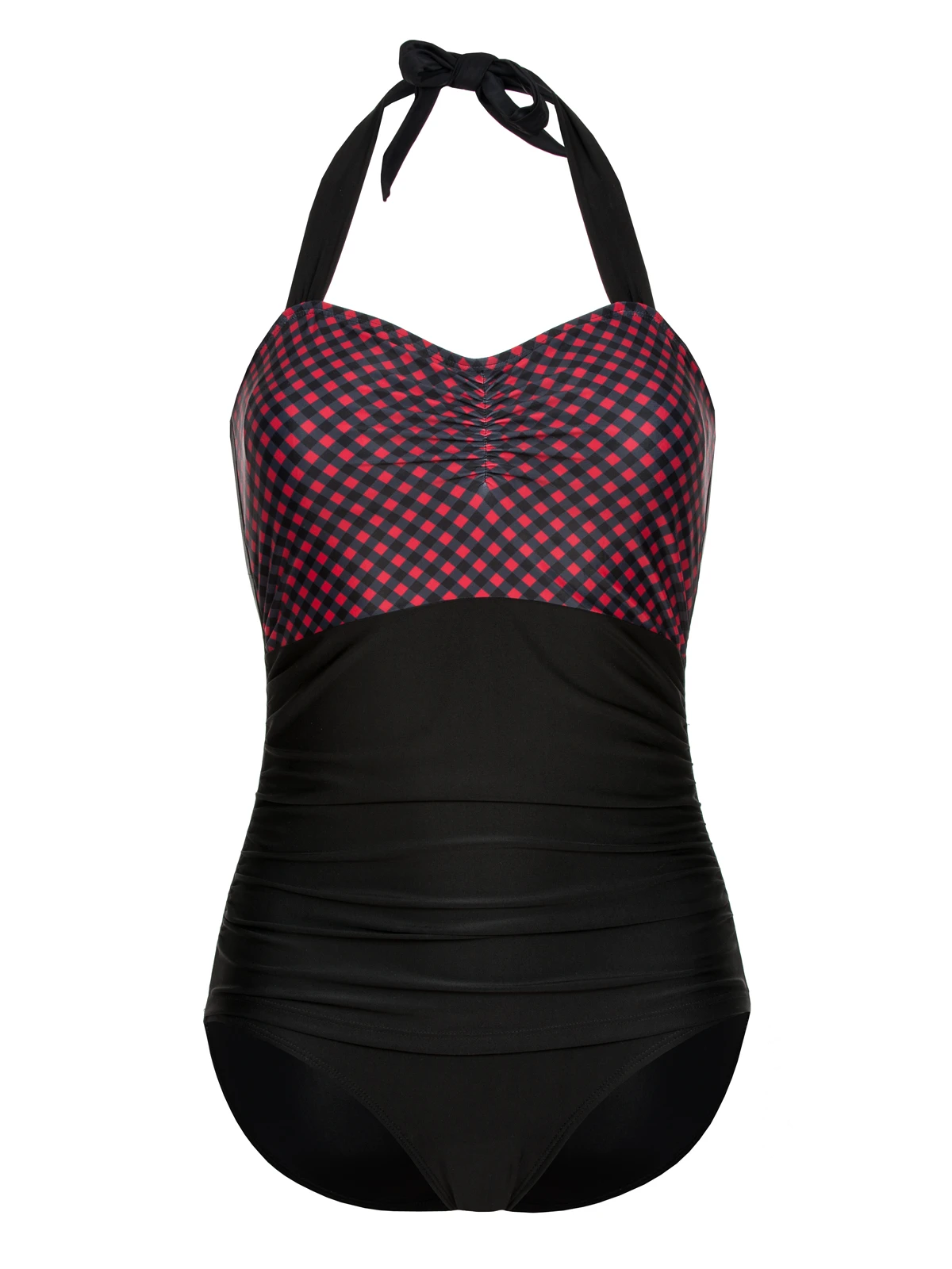 Ab ans Meer, an den See oder ins Freibad mit dem neuen super süßen Pussy Deluxe Badeanzug. Wenn du auf punkiges Karomuster stehst dann ist dieser Badeanzug perfekt für dich. Das Brustteil ist schwarz rot kariert. Es wird einmal im Nacken mit breiten Bindebändern gebunden. Die Cups sind leicht gefüttert. Der Auschnitt ist in der Mitte leicht gerafft. Der untere Teil des Badeanzuges ist schwarz. Das Material über dem Bauch ist an den Seiten leicht gerafft und kaschiert so prima eventuell Problelmzonen. Dieser Badeanzug ist das perfekte Outfit für alle Rockmiezen die das Wasser nicht scheuen!