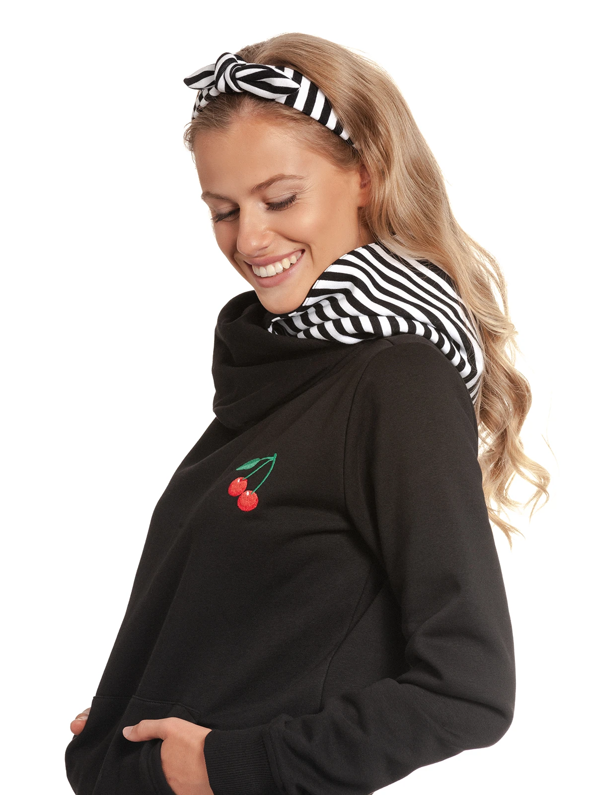 Mit dem Pussy Deluxs Stripes Schalkragenhoodie gut gestylt durch den Winter! Dieser schwarze Hoodie besteht aus einem weichen Baumwoll-Polyester-Material. Er kommt nicht alleine, sondern bringt noch ein süßes Stirnband mit einer geknoteten Schleife mit! Der Hoodie hat einen kuschelig hohen Schalkragen mit süßem Streifenmuster, der schwarz gefüttert ist. Eine zauberhafte Kirschstickerei auf der Brust lässt den Hoodie besonders verspielt wirken. Die Bündchen an den Ärmeln und am unteren Saum sind gerippt und ebenfalls schwarz. Eine Känguru-Tasche vorne rundet das Design ab.