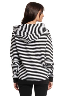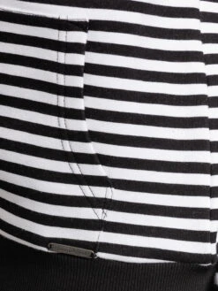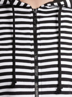 Pussy Deluxe auf Streifzug! Diese süße Sweatshirtjacke besteht aus einem weichen Baumwoll-Polyester-Mix. Der Stoff ist schwarz-weiß gestreift. Die Jacke hat eine schwarz gefütterte Kapuze mit Tunnelzug und einen durchgängigen Reißverschluss vorne. Die langen Ärmel und der Bund der Jacke werden werden von einem schwarzen Rippband gesäumt. Eine Känguru Tasche vorne sorgt für einen sportlichen Look. In Kombination mit einer schwarzen Jeans wird aus diesem Hoodie ein absolut süßes Freizeitoutfit.
