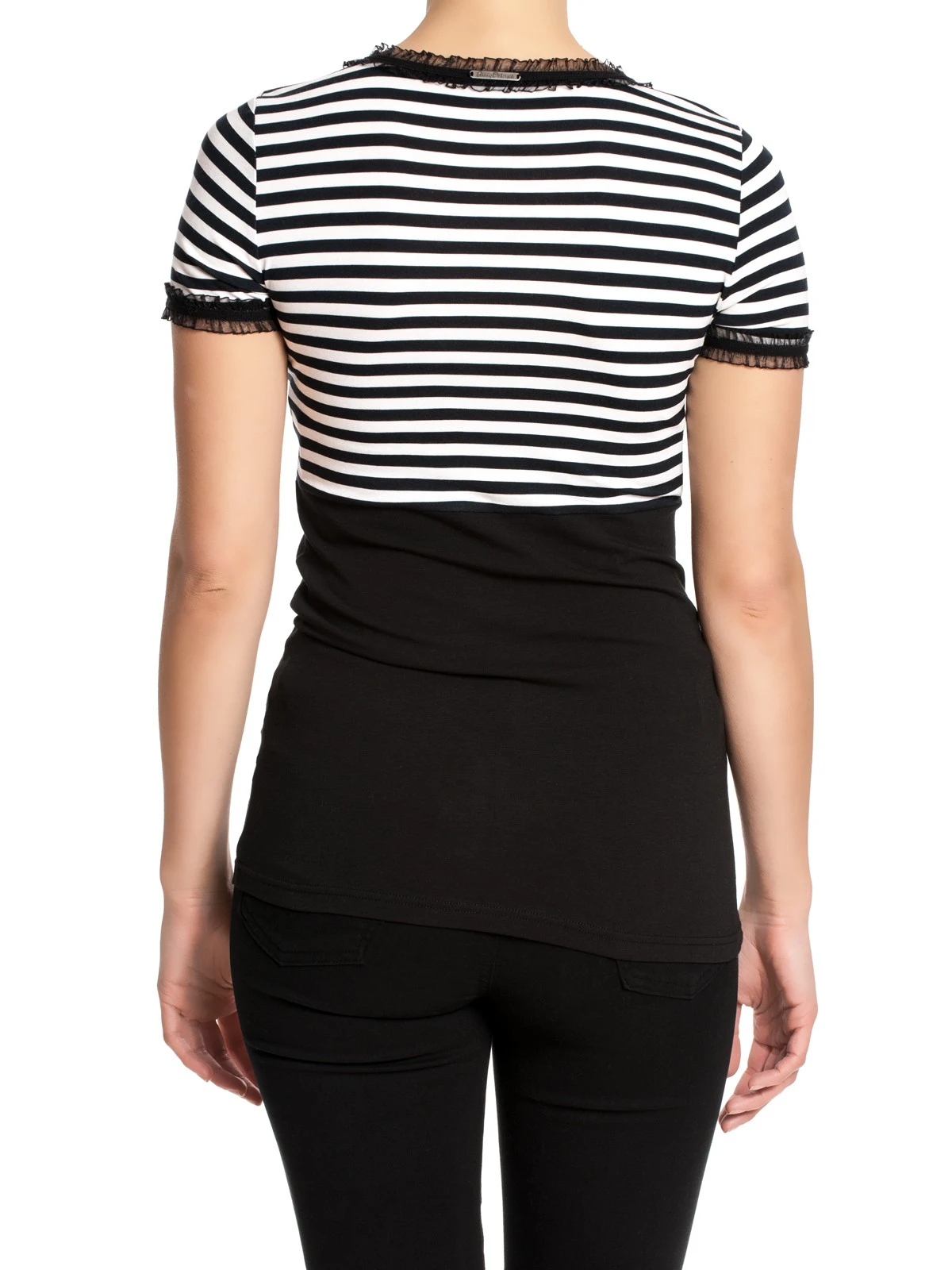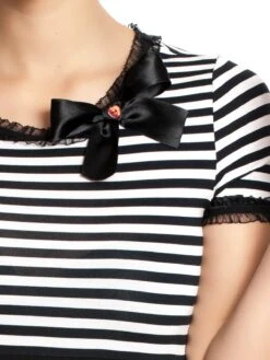 Das süße Pussy Deluxe Shirt ist aus einem angenehmen Baumwollmaterial mit Elasthananteil. Es ist figurbetont geschnitten, hat einen runden Halsausschnitt und kurze Ärmel, die mit einer aufgesetzten Organzarüsche abgeschlossen werden. Der komplette obere Teil ist im angesagten Streifenlook in schwarz und weiß gehalten. Am Kragen ist eine Brosche angebracht, eine schwarze Satinschleife mit einem roten Herzknopf in der Mitte. Diese Schleife kann nach belieben an einer anderen Stelle festgemacht oder auch ganz abgenommen werden. Der untere Teil des Shirts ist schwarz. Ein wahres Sommershirt, dass sofort gute Laune hervorzaubert und in unserem Kleiderschrank nicht fehlen darf. Natürlich gibt es das Streifenshirt auch in weiteren Farben, so dass man sich fast nicht zwischen blau, rot, weiß oder grün oder schwarz entscheiden kann.