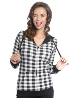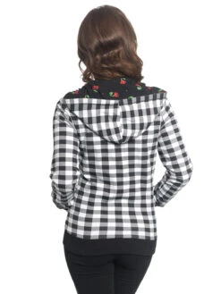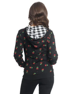 Diese supercoole Pussy Deluxe Wendejacke bietet gleich zwei stylische Varianten. Grundsätzlich ist die Jacke aus einem angenehmen Baumwoll-Elastan-Mix, sie hat eine Kapuze mit Kordelzug, einen Reißverschluss und zwei Einschubtaschen. Die langen Ärmel enden in gerippten Bündchen. Die eine Seite zeigt einen süßen allover Kirschenprint, die andere zeigt Karos in schwarz-weiß. Das wirklich coole daran ist, egal für welche Seite man sich entscheidet, die andere ist dennoch sichtbar. Denn durch die Wendemöglichkeit blitzt das zweiseitige Muster immer wieder hervor. So wirkt die Jacke ausgefallen und keinesfalls langweilig. Die Jacke ist enganliegend, wirkt aber locker, wenn man sie offen trägt.Â