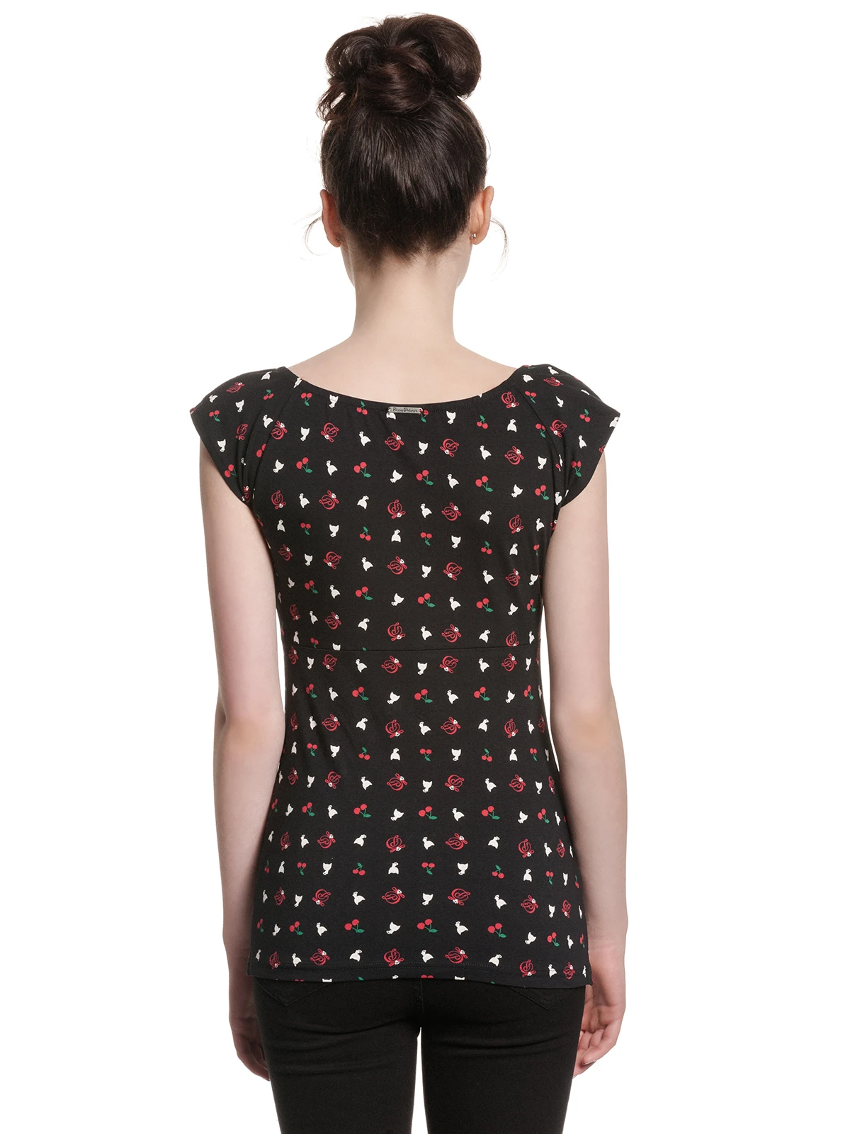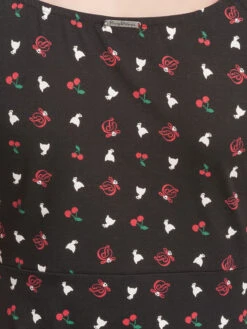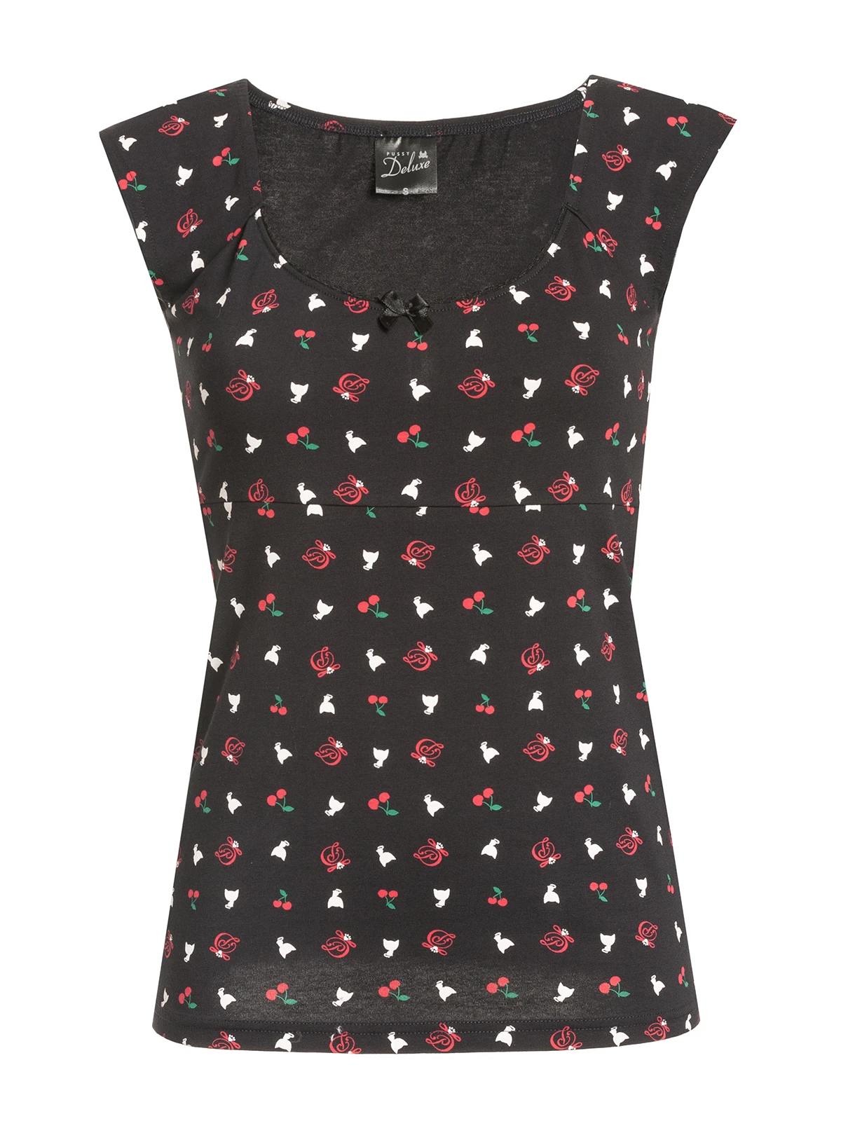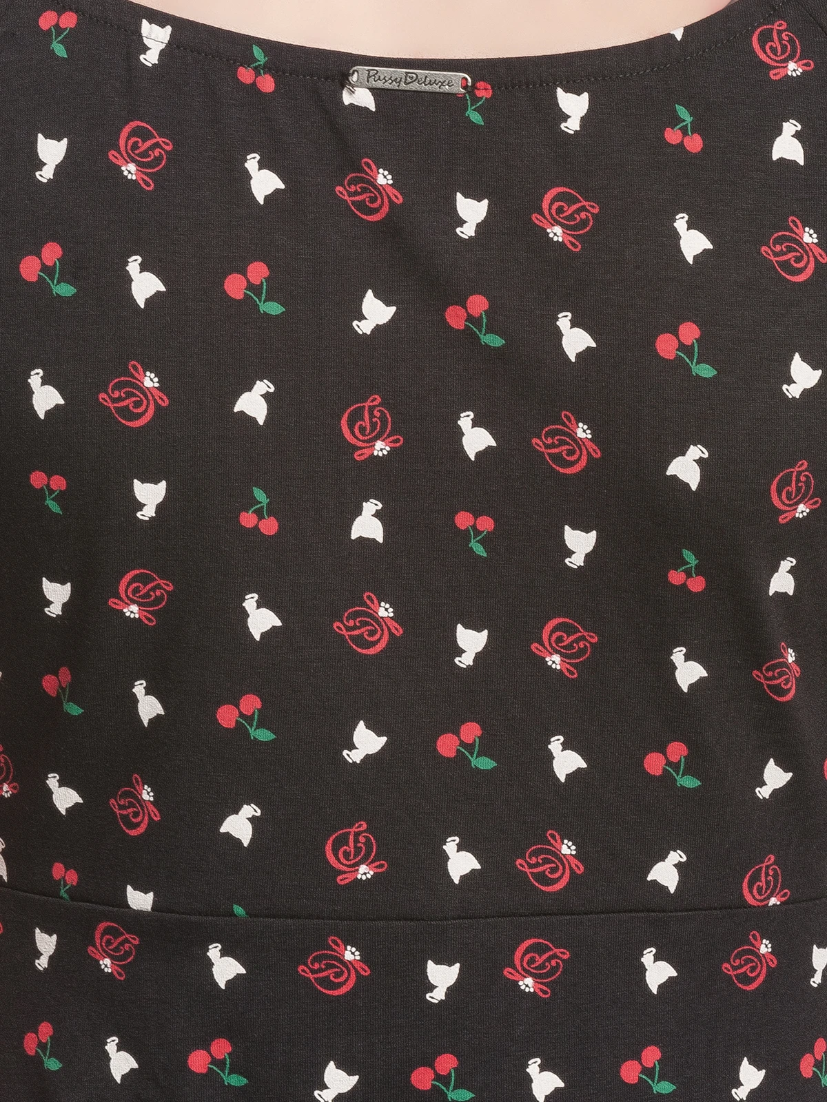 Das total süße Pussy Deluxe Shirt ist aus einem angenehmen Baumwollmaterial mit Elasthananteil. Es ist figurbetont geschnitten, hat kurze Arme und einen großen Halsausschnitt, der mit einer schwarze Litze sowie einer schwarze Satinschleife verziert ist. Der Aufdruck zeigt kleine Pussy Deluxe Symbole wie eine weiße Katze, ein verschnörkeltes D oder auch Kirschen. Ein absolut tolles Shirt, in dem wir uns schon auf den Sommer freuen. Das ‚White Kitten Girl‘ Shirt ist eine Liebeserklärung von allen Pussy Deluxe Fans. Es ist bequem, zaubert eine tolle Figur und der Druck steckt voller liebevoller Details. Es passt hervorragend zu schwarzen Jeans und verschönert definitiv unseren Büroalltag.