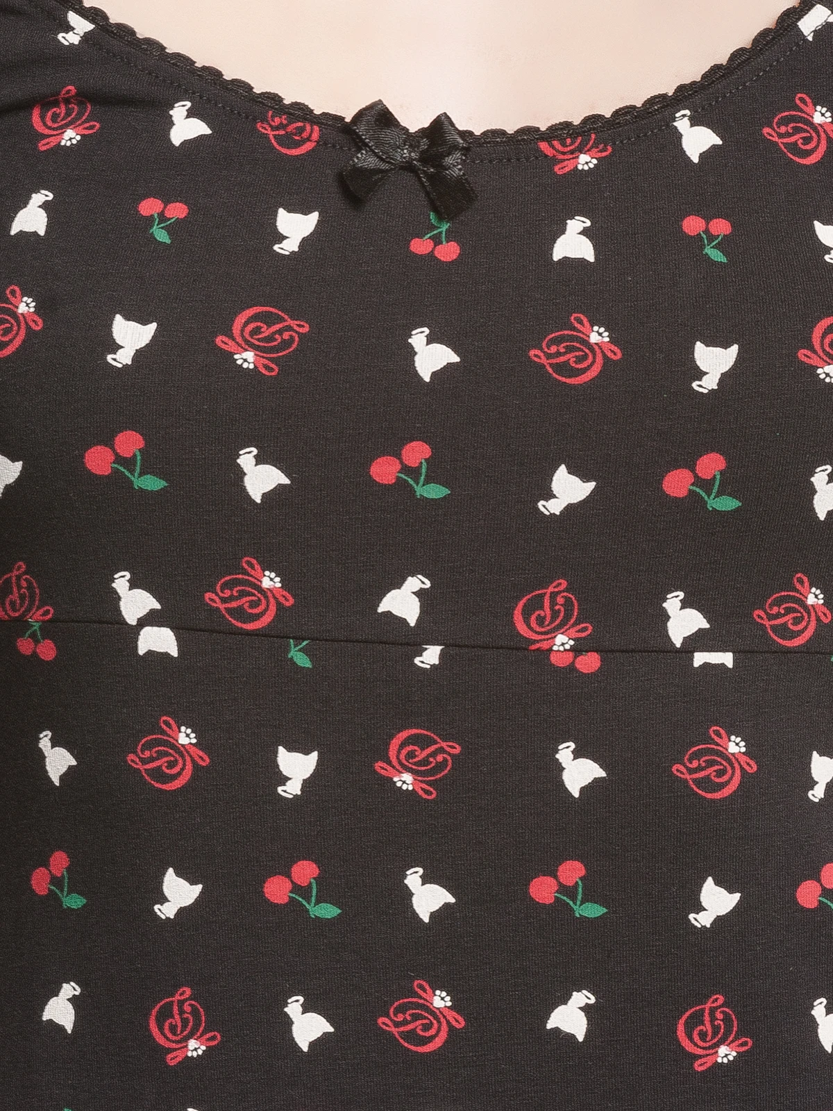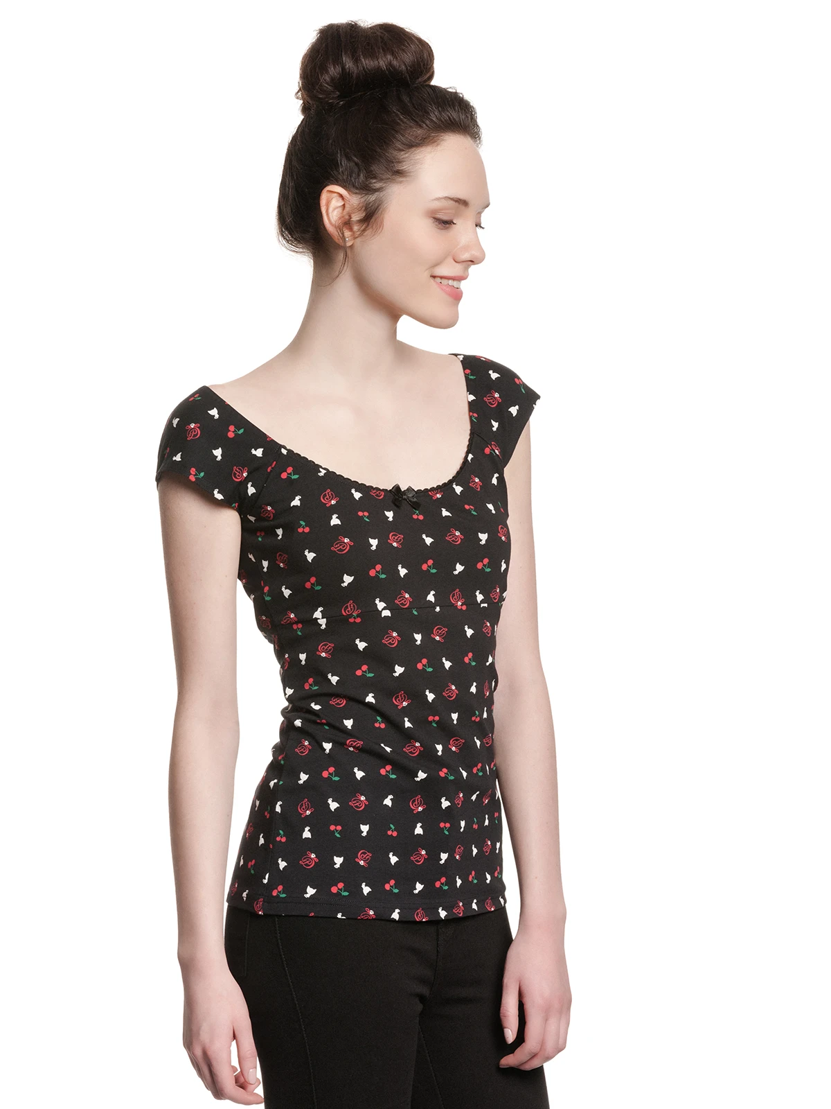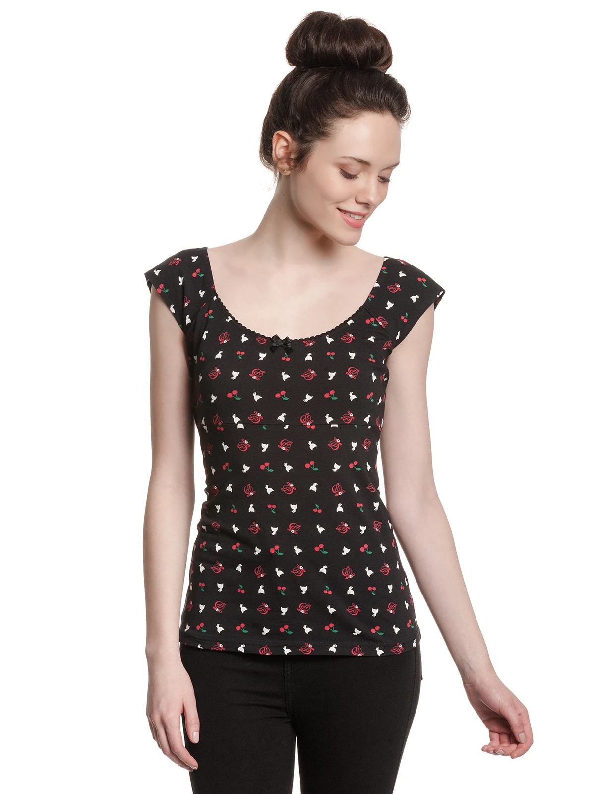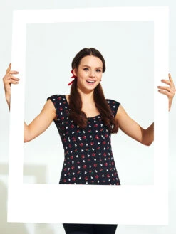 Das total süße Pussy Deluxe Shirt ist aus einem angenehmen Baumwollmaterial mit Elasthananteil. Es ist figurbetont geschnitten, hat kurze Arme und einen großen Halsausschnitt, der mit einer schwarze Litze sowie einer schwarze Satinschleife verziert ist. Der Aufdruck zeigt kleine Pussy Deluxe Symbole wie eine weiße Katze, ein verschnörkeltes D oder auch Kirschen. Ein absolut tolles Shirt, in dem wir uns schon auf den Sommer freuen. Das ‚White Kitten Girl‘ Shirt ist eine Liebeserklärung von allen Pussy Deluxe Fans. Es ist bequem, zaubert eine tolle Figur und der Druck steckt voller liebevoller Details. Es passt hervorragend zu schwarzen Jeans und verschönert definitiv unseren Büroalltag.